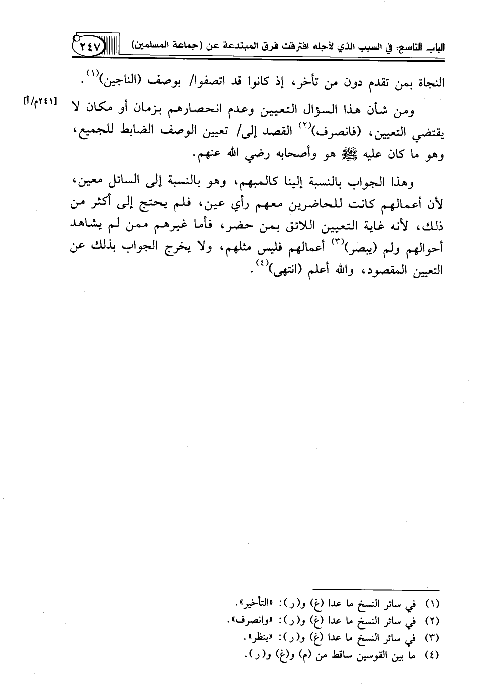 وَمِنْ شَأْنِ هَذَا السُّؤَالِ التَّعْيِينُ وَعَدَمُ انْحِصَارِهِمْ بزمان أو مكان لا يقتضي التعيين، (فانصرف) (¬2) القصد إلى/ تعيين الوصف الضابط للجميع، وهو ما كان عليه صلّى الله عليه وسلّم هو وأصحابه رضي الله عنهم.