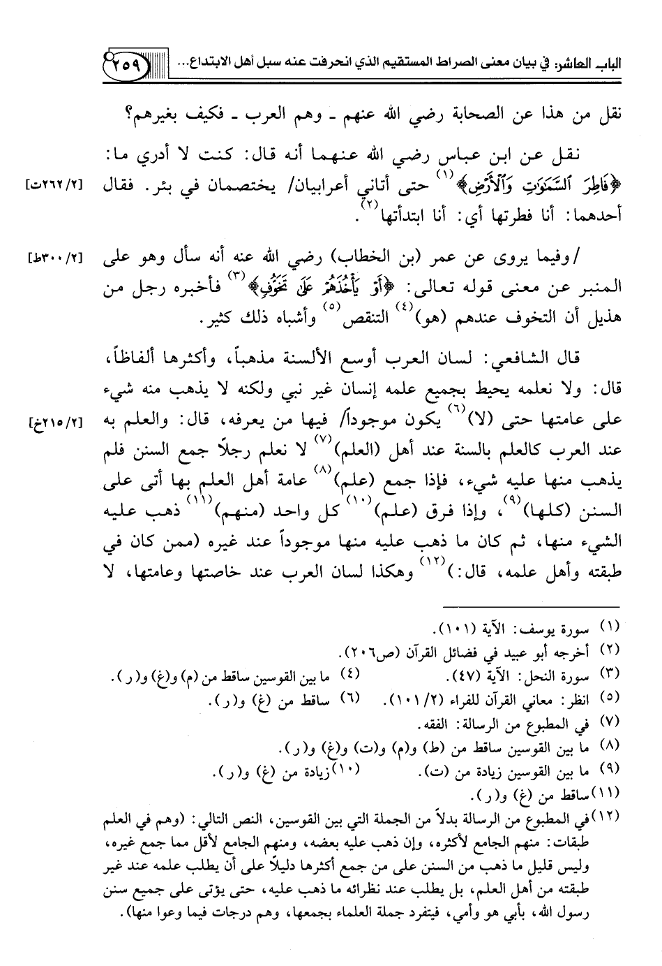 (¬12) في المطبوع من الرسالة بدلاً من الجملة التي بين القوسين، النص التالي: (وهم في العلم طبقات: منهم الجامع لأكثره، وإن ذهب عليه بعضه، ومنهم الجامع لأقل مما جمع غيره، وليس قليل ما ذهب من السنن على من جمع أكثرها دليلاً على أن يطلب علمه عند غير طبقته من أهل العلم، بل يطلب عند نظرائه ما ذهب عليه، حتى يؤتى على جميع سنن رسول الله، بأبي هو وأمي، فيتفرد جملة العلماء بجمعها، وهم درجات فيما وعوا منها).