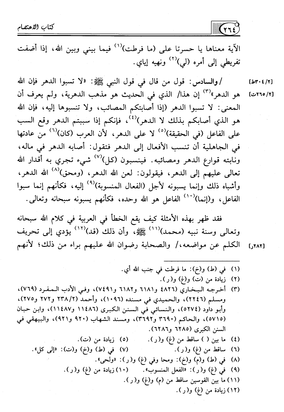 /وَالسَّادِسُ: قَوْلُ مَنْ قَالَ فِي قَوْلِ النَّبِيِّ صَلَّى اللَّهُ عَلَيْهِ وَسَلَّمَ: "لَا تَسُبُّوا الدَّهْرَ فَإِنَّ اللَّهَ هُوَ الدَّهْرُ" (¬3) إِنَّ هَذَا/ الَّذِي فِي الْحَدِيثِ هُوَ مَذْهَبُ الدَّهْرِيَّةِ، وَلَمْ يَعْرِفْ أَنَّ الْمَعْنَى: لَا تَسُبُّوا الدَّهْرَ (إِذَا أَصَابَتْكُمُ الْمَصَائِبَ، وَلَا تَنْسُبُوهَا إِلَيْهِ، فَإِنَّ اللَّهَ هُوَ الَّذِي أَصَابَكُمْ بِذَلِكَ لَا الدَّهْرُ) (¬4)، فَإِنَّكُمْ إِذَا سَبَبْتُمُ الدَّهْرَ وَقَعَ السَّبُّ عَلَى الفاعل (في الحقيقة) (¬5) لَا عَلَى الدَّهْرِ، لِأَنَّ الْعَرَبَ (كَانَ) (¬6) مِنْ عَادَتِهَا فِي الْجَاهِلِيَّةِ أَنْ تَنْسُبَ الْأَفْعَالَ إِلَى الدَّهْرِ فَتَقُولُ: أَصَابَهُ الدَّهْرُ فِي مَالِهِ، وَنَابَتْهُ قوارع الدهر ومصائبه. فينسبون (كُلِّ) (¬7) شَيْءٍ تَجْرِي بِهِ أَقْدَارُ اللَّهِ تَعَالَى عَلَيْهِمْ إِلَى الدَّهْرِ، فَيَقُولُونَ: لَعَنَ اللَّهُ الدَّهْرَ، (ومحق) (¬8) اللَّهُ الدَّهْرَ، وَأَشْبَاهُ ذَلِكَ وَإِنَّمَا يَسُبُّونَهُ لِأَجْلِ (الْفِعَالِ الْمَنْسُوبَةِ) (¬9) إِلَيْهِ، فَكَأَنَّهُمْ إِنَّمَا سَبُّوا الْفَاعِلَ، و (إنما) (¬10) الفاعل هُوَ اللَّهُ وَحْدَهُ، فَكَأَنَّهُمْ يَسُبُّونَهُ سُبْحَانَهُ وَتَعَالَى.