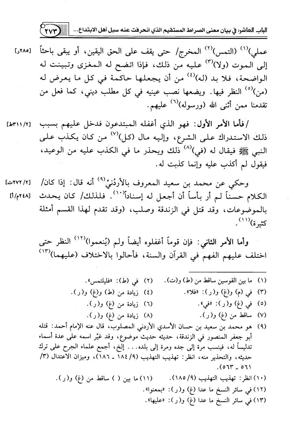 (¬9) هو محمد بن سعيد بن حسان الأسدي الأردني المصلوب، قال عنه الإمام أحمد: قتله أبو جعفر المنصور في الزندقة، حديثه حديث موضوع، وقد غيَّر اسمه على عدة أسماء تدليساً له، فينسب مرة إلى جده ومرة إلى بلده ... إلخ، أجمع علماء الجرح على ترك حديثه، والتحذير منه، انظر: تهذيب التهذيب (9 184 ـ 186)، وميزان الاعتدال (3 561 ـ 563).