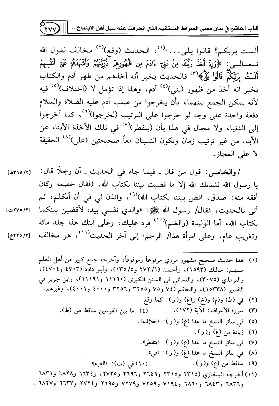 ألست بربكم؟ قالوا بلى ... " (¬1)، الحديث (وَقَعَ) (¬2) مُخَالِفٌ لِقَوْلِ اللَّهِ تَعَالَى: {وَإِذْ أَخَذَ رَبُّكَ مِنْ بَنِي آدَمَ مِنْ ظُهُورِهِمْ ذُرِّيَّتَهُمْ وَأَشْهَدَهُمْ عَلَى أَنْفُسِهِمْ أَلَسْتُ بِرَبِّكُمْ قَالُوا بَلَى} (¬3) فالحديث يخبر أَنَّهُ أَخَذَهُمْ مِنْ ظَهْرِ آدَمَ وَالْكِتَابُ يُخْبِرُ أَنَّهُ أَخَذَ مِنْ ظُهُورِ (بَنِي) (¬4) آدَمَ، وَهَذَا إذا تؤمل لا (اختلاف) (¬5) فِيهِ لِأَنَّهُ يُمْكِنُ الْجَمْعُ بَيْنَهُمَا، بِأَنْ يَخْرُجُوا مِنْ صُلْبِ آدَمَ عَلَيْهِ الصَّلَاةُ وَالسَّلَامُ دَفْعَةً وَاحِدَةً عَلَى وَجْهٍ لَوْ خَرَجُوا عَلَى التَّرْتِيبِ (لخرجوا) (¬6)، كَمَا أُخْرِجُوا إِلَى الدُّنْيَا، وَلَا مُحَالَ فِي هذا بأن (ينفطر) (¬7) فِي تِلْكَ الْآخِذَةِ الْأَبْنَاءُ عَنِ الْأَبْنَاءِ مِنْ غَيْرِ تَرْتِيبِ زَمَانٍ وَتَكُونُ النِّسْبَتَانِ مَعًا صَحِيحَتَيْنِ (على) (¬8) الْحَقِيقَةِ لَا عَلَى الْمَجَازِ.