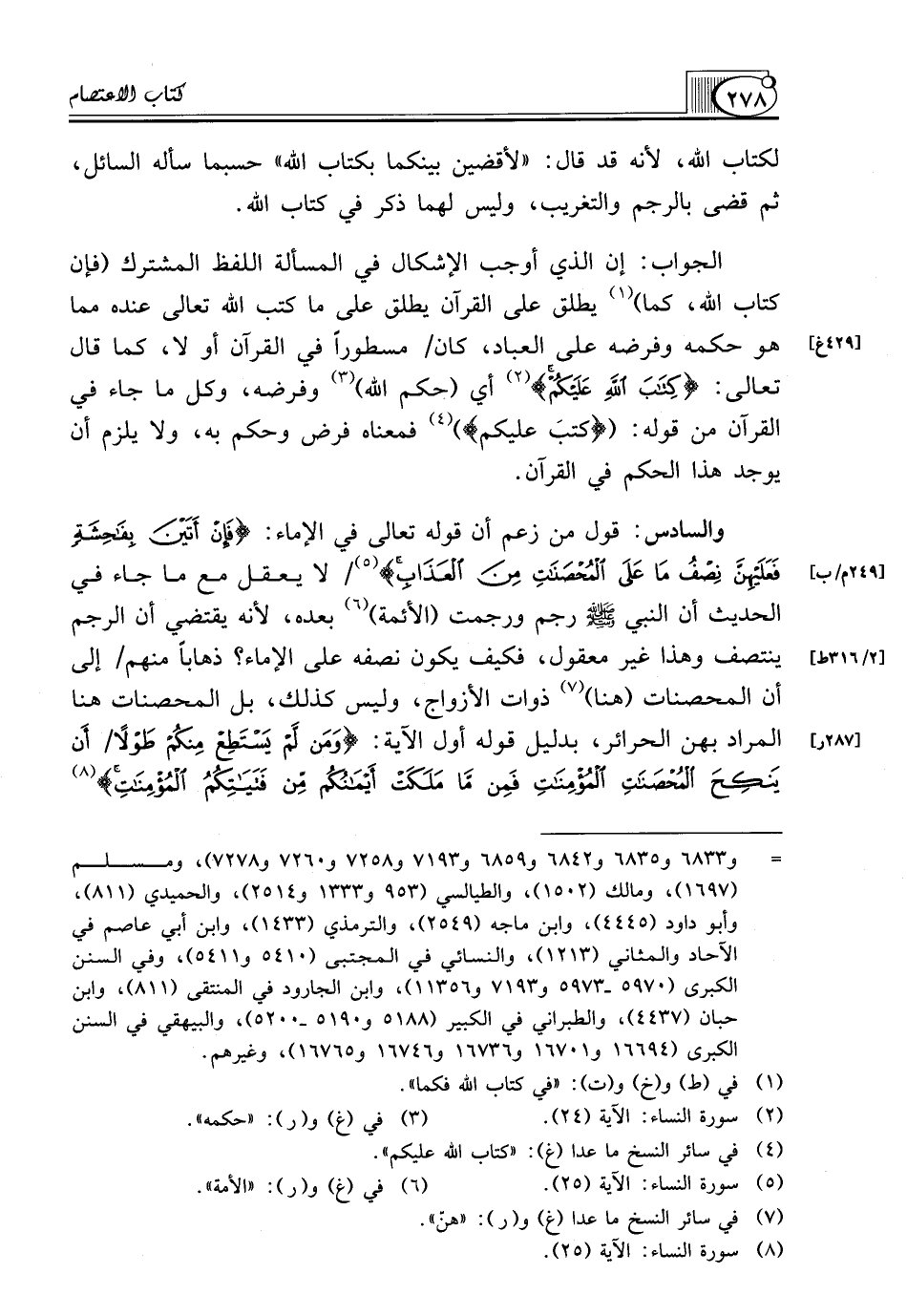 الْجَوَابُ: إِنَّ الَّذِي أَوْجَبَ الْإِشْكَالَ فِي المسألة اللفظ المشترك (فإن كتاب الله، كما) (¬1) يُطْلَقُ عَلَى الْقُرْآنِ يُطْلَقُ عَلَى مَا كَتَبَ اللَّهُ تَعَالَى عِنْدَهُ مِمَّا هُوَ حُكْمُهُ وَفَرْضُهُ على العباد، كان/ مسطوراً في القرآن أو لا، كما قال تعالى: {كِتَابَ اللَّهِ عَلَيْكُمْ} (¬2) أي (حكم الله) (¬3) وفرضه، وَكُلُّ مَا جَاءَ فِي الْقُرْآنِ مِنْ قَوْلِهِ: ({كتبَ عليكم}) (¬4) فمعناه فرض وَحَكَمَ بِهِ، وَلَا يَلْزَمُ أَنَّ يُوجَدَ هَذَا الْحُكْمُ فِي الْقُرْآنِ.