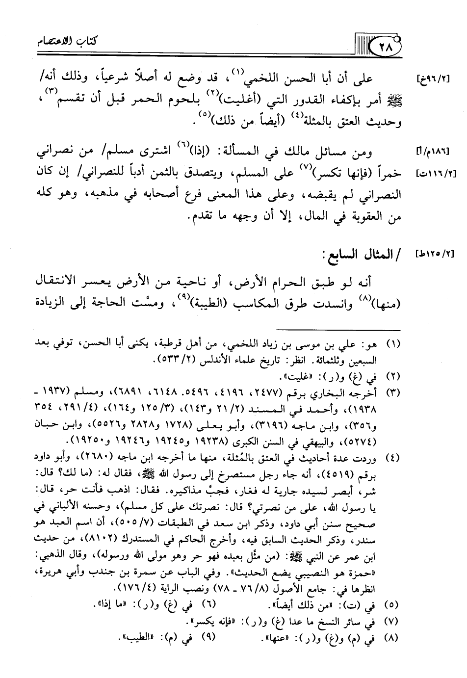 عَلَى أَنَّ أَبَا الْحَسَنِ اللَّخْمِيَّ (¬1)، قَدْ وَضَعَ له أصلاً شرعياً، وذلك أنه/ صلّى الله عليه وسلّم أَمَرَ بِإِكْفَاءِ الْقُدُورِ الَّتِي (أُغْلِيَتْ) (¬2) بِلُحُومِ الْحُمُرِ قَبْلَ أَنْ تُقَسَّمَ (¬3)، وَحَدِيثُ الْعِتْقِ بِالْمُثْلَةِ (¬4) (أَيْضًا مِنْ ذَلِكَ) (¬5).