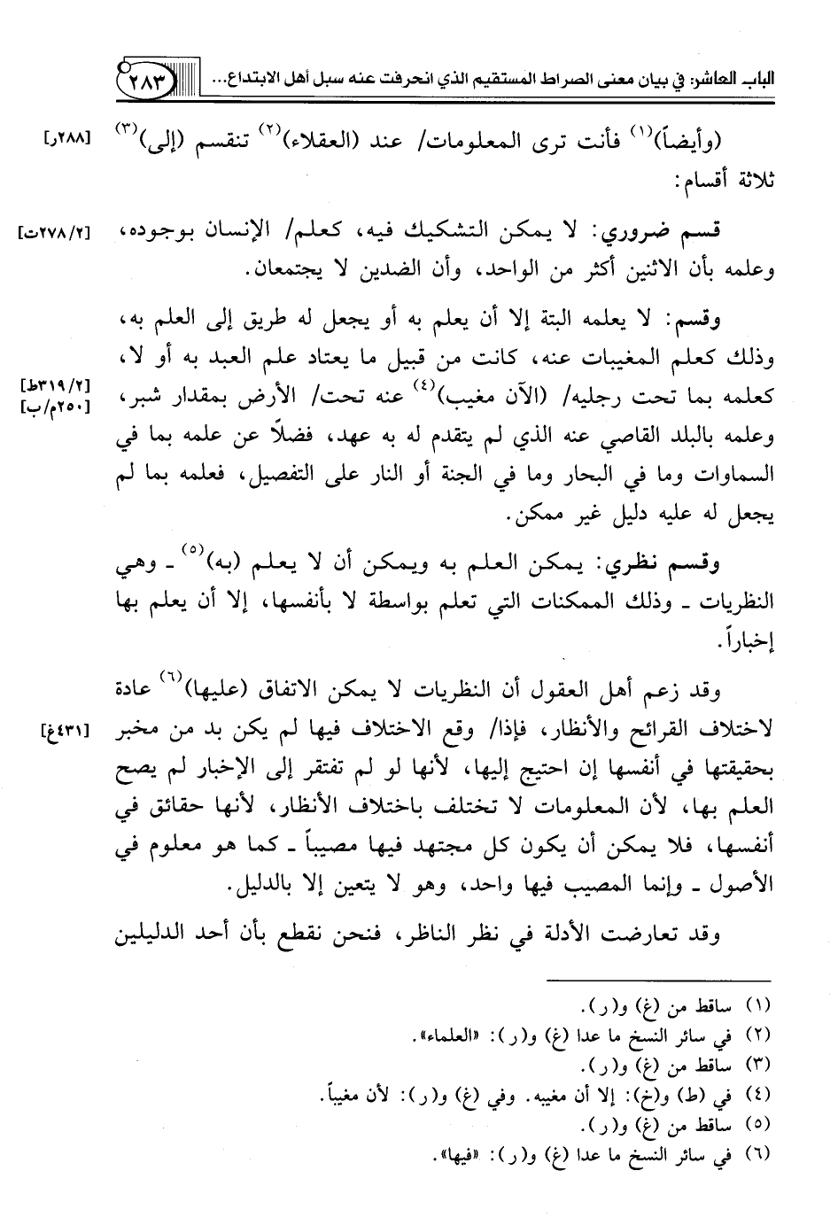 (وأيضاً) (¬1) فأنت ترى المعلومات/ عند (العقلاء) (¬2) تَنْقَسِمُ (إِلَى) (¬3) ثَلَاثَةِ أَقْسَامٍ: