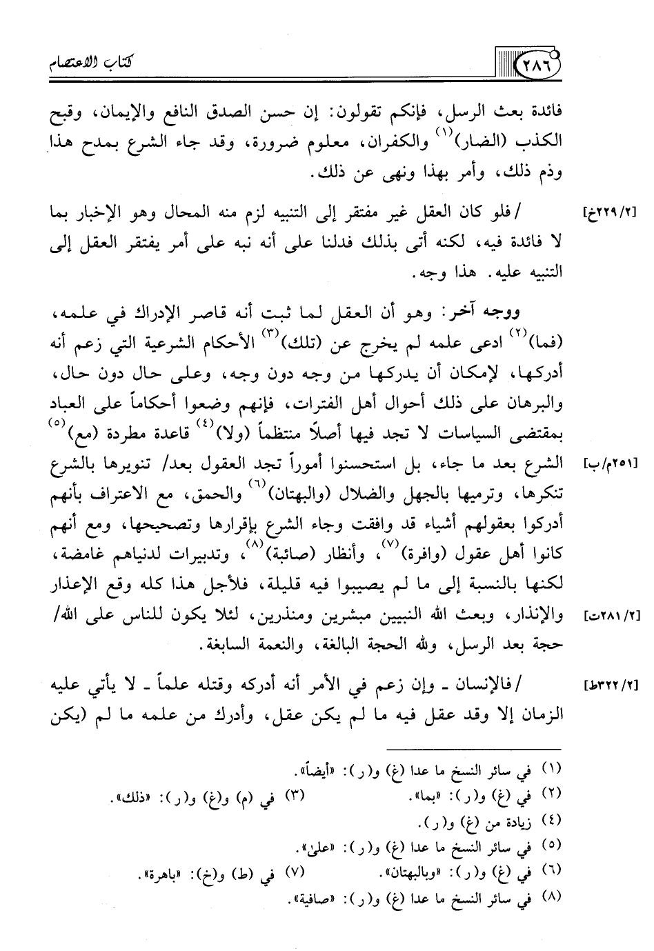 وَوَجْهٌ آخَرُ: وَهُوَ أَنَّ الْعَقْلَ لَمَّا ثَبَتَ أَنَّهُ قَاصِرُ الْإِدْرَاكِ فِي عِلْمِهِ، (فَمَا) (¬2) ادَّعَى عِلْمَهُ لَمْ يَخْرُجْ عَنْ (تِلْكَ) (¬3) الْأَحْكَامِ الشَّرْعِيَّةِ الَّتِي زَعَمَ أَنَّهُ أَدْرَكَهَا، لِإِمْكَانِ أَنْ يُدْرِكَهَا مِنْ وَجْهٍ دُونَ وَجْهٍ، وَعَلَى حَالٍ دُونَ حَالٍ، وَالْبُرْهَانُ عَلَى ذَلِكَ أَحْوَالُ أَهْلِ الْفَتَرَاتِ، فَإِنَّهُمْ وَضَعُوا أَحْكَامًا عَلَى الْعِبَادِ بِمُقْتَضَى السِّيَاسَاتِ لَا تَجِدُ فِيهَا أَصْلًا مُنْتَظِمًا (ولا) (¬4) قاعدة مطردة (مع) (¬5) الشَّرْعِ بَعْدَ مَا جَاءَ، بَلِ اسْتَحْسَنُوا أُمُورًا تَجِدُ الْعُقُولَ بَعْدَ/ تَنْوِيرِهَا بِالشَّرْعِ تُنْكِرُهَا، وَتَرْمِيهَا بِالْجَهْلِ وَالضَّلَالِ (وَالْبُهْتَانِ) (¬6) وَالْحُمْقِ، مَعَ الِاعْتِرَافِ بِأَنَّهُمْ أَدْرَكُوا بِعُقُولِهِمْ أَشْيَاءَ قَدْ وَافَقَتْ وَجَاءَ الشَّرْعُ بِإِقْرَارِهَا وَتَصْحِيحِهَا، وَمَعَ أَنَّهُمْ كَانُوا أَهْلَ عُقُولٍ (وافرة) (¬7)، وأنظار (صائبة) (¬8)، وَتَدْبِيرَاتٍ لِدُنْيَاهُمْ غَامِضَةٍ، لَكِنَّهَا بِالنِّسْبَةِ إِلَى مَا لم يُصِيبُوا فِيهِ قَلِيلَةٌ، فَلِأَجْلِ هَذَا كُلِّهِ وَقَعَ الْإِعْذَارُ وَالْإِنْذَارُ، وَبَعَثَ اللَّهُ النَّبِيِّينَ مُبَشِّرِينَ وَمُنْذِرِينَ، لِئَلَّا يَكُونَ لِلنَّاسِ عَلَى اللَّهِ/ حُجَّةٌ بَعْدَ الرُّسُلِ، وَلِلَّهِ الْحُجَّةُ الْبَالِغَةُ، وَالنِّعْمَةُ السَّابِغَةُ.