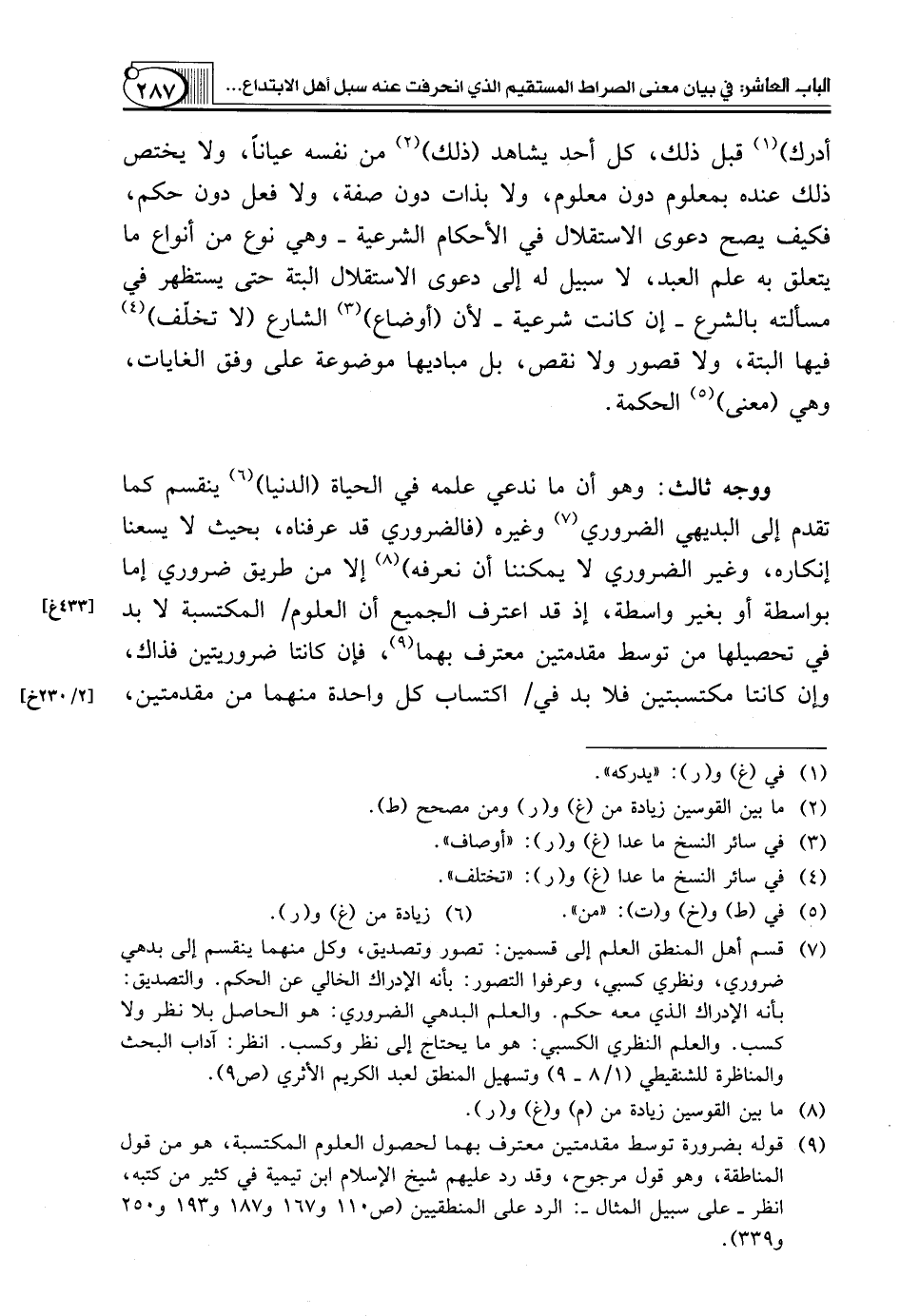 (¬9) قوله بضرورة توسط مقدمتين معترف بهما لحصول العلوم المكتسبة، هو من قول المناطقة، وهو قول مرجوح، وقد رد عليهم شيخ الإسلام ابن تيمية في كثير من كتبه، انظر ـ على سبيل المثال ـ: الرد على المنطقيين (ص110 و167 و187 و193 و250 و339).