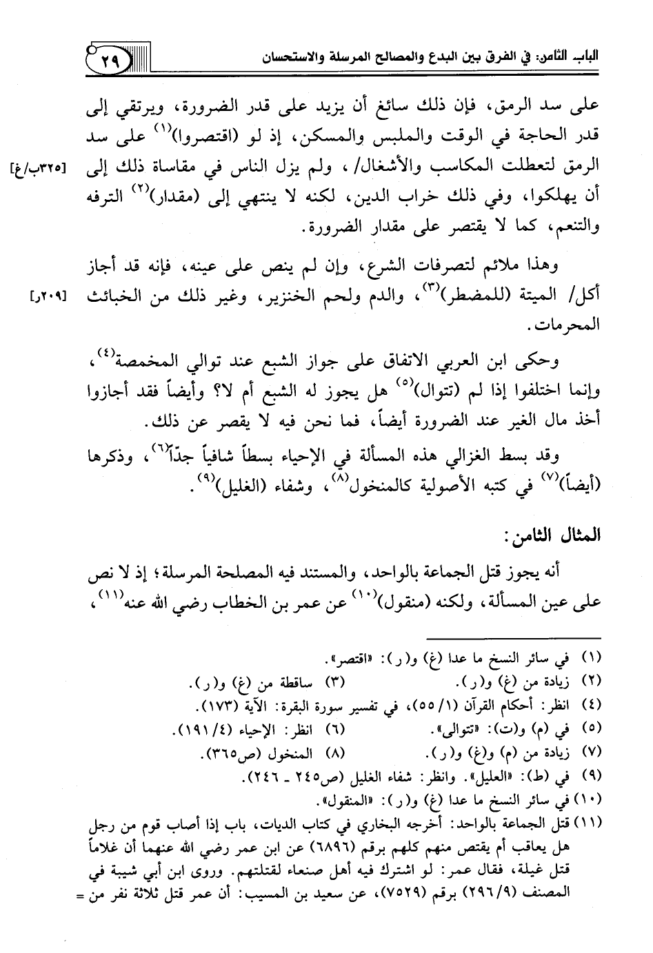 وَقَدْ بَسَطَ الْغَزَالِيُّ هَذِهِ الْمَسْأَلَةَ فِي الْإِحْيَاءِ بَسْطًا شَافِيًا جداً (¬6)، وذكرها (أيضاً) (¬7) في كتبه الأصولية كالمنخول (¬8)، وشفاء (الغليل) (¬9).