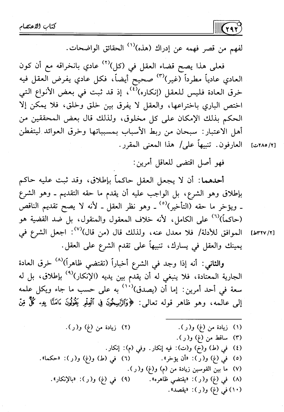 وَالثَّانِي: أَنَّهُ إِذَا وَجَدَ فِي الشَّرْعِ أَخْبَارًا (تَقْتَضِي ظَاهِرًا) (¬8) خَرْقَ الْعَادَةِ الْجَارِيَةِ الْمُعْتَادَةِ، فَلَا يَنْبَغِي لَهُ أَنْ يُقَدِّمَ بَيْنَ يَدَيْهِ (الْإِنْكَارَ) (¬9) بِإِطْلَاقٍ، بَلْ لَهُ سَعَةٌ فِي أَحَدِ أَمْرَيْنِ: إِمَّا أَنْ (يُصَدِّقَ) (¬10) بِهِ عَلَى حَسَبِ مَا جَاءَ وَيَكِلُ عِلْمَهُ إِلَى عَالِمِهِ، وَهُوَ ظَاهِرُ قَوْلِهِ تَعَالَى: {وَالرَّاسِخُونَ فِي الْعِلْمِ يَقُولُونَ آمَنَّا بِهِ كُلٌّ مِنْ