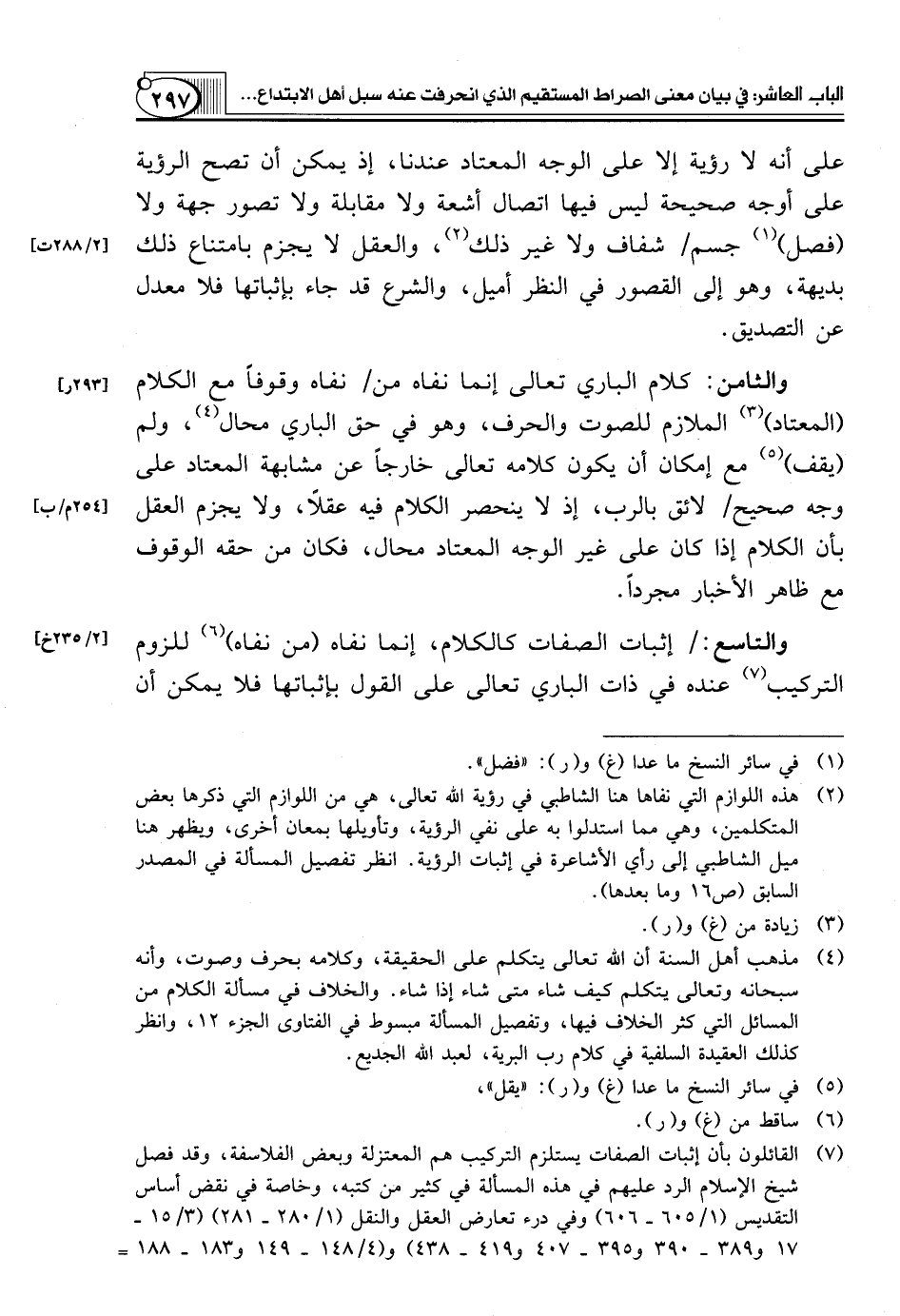 (¬2) هذه اللوازم التي نفاها هنا الشاطبي في رؤية الله تعالى، هي من اللوازم التي ذكرها بعض المتكلمين، وهي مما استدلوا به على نفي الرؤية، وتأويلها بمعان أخرى، ويظهر هنا ميل الشاطبي إلى رأي الأشاعرة في إثبات الرؤية. انظر تفصيل المسألة في المصدر السابق (ص16 وما بعدها).