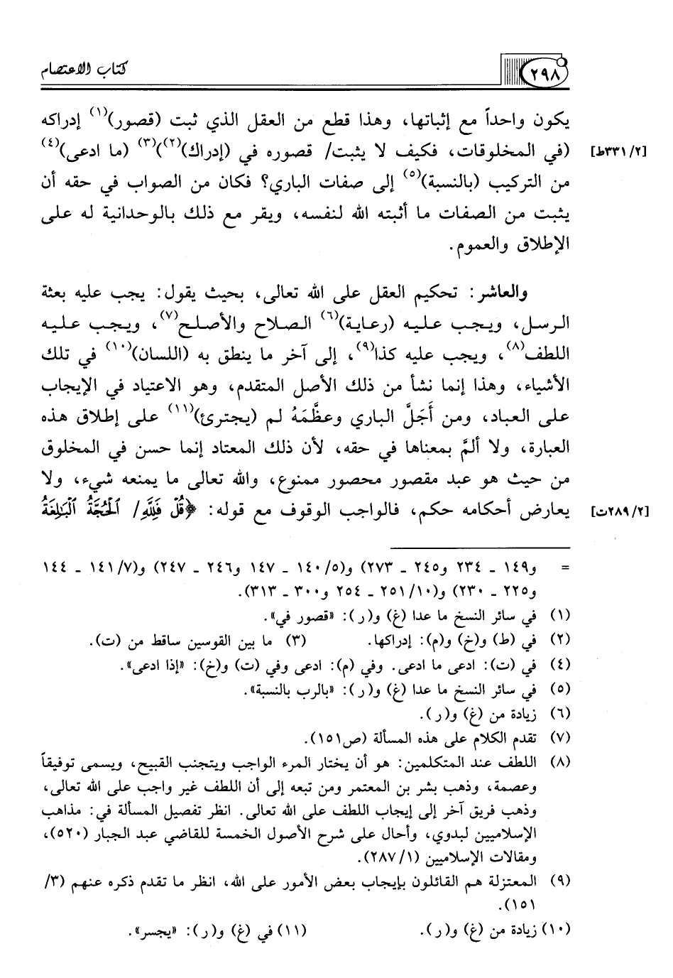 (¬9) المعتزلة هم القائلون بإيجاب بعض الأمور على الله، انظر ما تقدم ذكره عنهم (3/ 151).