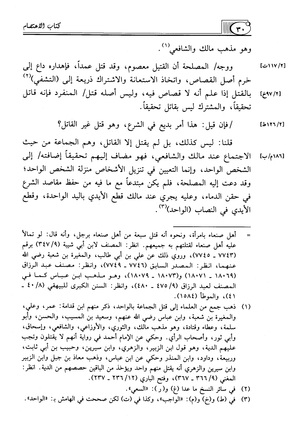 =أهل صنعاء بامرأة، ونحوه أنه قتل سبعة من أهل صنعاء برجل، وأنه قال: لو تمالأ عليه أهل صنعاء لقتلتهم به جميعهم. انظر: المصنف لابن أبي شيبة (9 347) برقم (7743 ـ 7745)، وروي ذلك عن علي بن أبي طالب، والمغيرة بن شعبة رضي الله عنهما، انظر: المصدر السابق (7746 ـ 7749)، وانظر: مصنف عبد الرزاق (18069 ـ 18071) و (18073 ـ 18079)، وهو مذهب ابن عباس كما في المصنف لعبد الرزاق (9 475 ـ 480)، وانظر: السنن الكبرى للبيهقي (8 40 ـ 41)، والموطأ (1584).