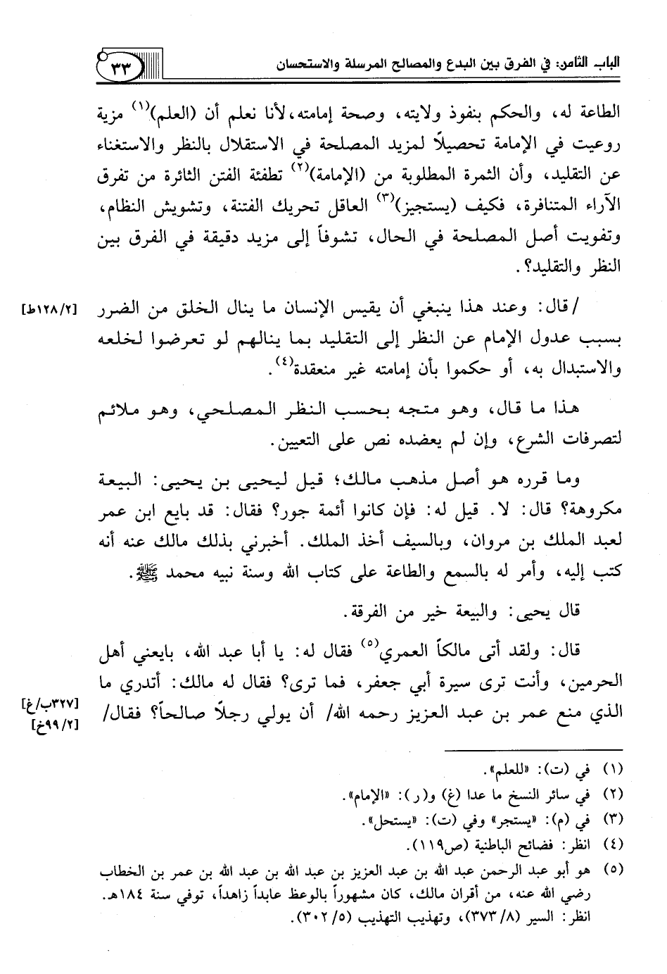 وَمَا قَرَّرَهُ هُوَ أَصْلُ مَذْهَبِ مَالِكٍ؛ قِيلَ لِيَحْيَى بْنِ يَحْيَى: الْبَيْعَةُ مَكْرُوهَةٌ؟ قَالَ: لَا. قِيلَ لَهُ: فَإِنْ كَانُوا أَئِمَّةَ جَوْرٍ؟ فَقَالَ: قَدْ بَايَعَ ابْنُ عُمَرَ لِعَبْدِ الْمَلِكِ بْنِ مَرْوَانَ، وَبِالسَّيْفِ أَخَذَ الْمُلْكَ. أَخْبَرَنِي بِذَلِكَ مَالِكٌ عَنْهُ أَنَّهُ كَتَبَ إِلَيْهِ، وَأَمَرَ لَهُ بِالسَّمْعِ وَالطَّاعَةِ عَلَى كِتَابِ اللَّهِ وَسُنَّةِ نَبِيِّهِ محمد صلّى الله عليه وسلّم.