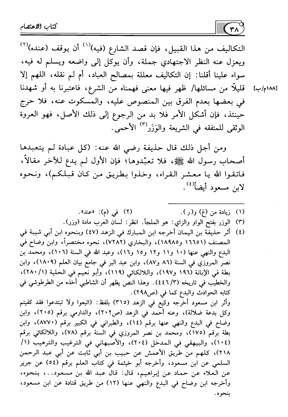 (¬4) أثر حذيفة بن اليمان أخرجه ابن المبارك في الزهد (47) وبنحوه ابن أبي شيبة في المصنف (16651 و18985)، والبخاري (7282)، نحوه مختصراً، وابن وضاح في البدع والنهي عنها (10 و11 و12 و15 و16)، وعبد الله في السنة (106)، ومحمد بن نصر المروزي في السنة (86 و87)، وابن عبد البر في جامع بيان العلم (1809)، وابن بطة في الإبانة (196 و197)، واللالكائي (119)، وأبو نعيم في الحلية (1 280)، والخطيب في تاريخه (3 446). وهذا النص يظهر أن الشاطبي أخذه من الطرطوشي في كتابه الحوادث والبدع كما في (ص298).