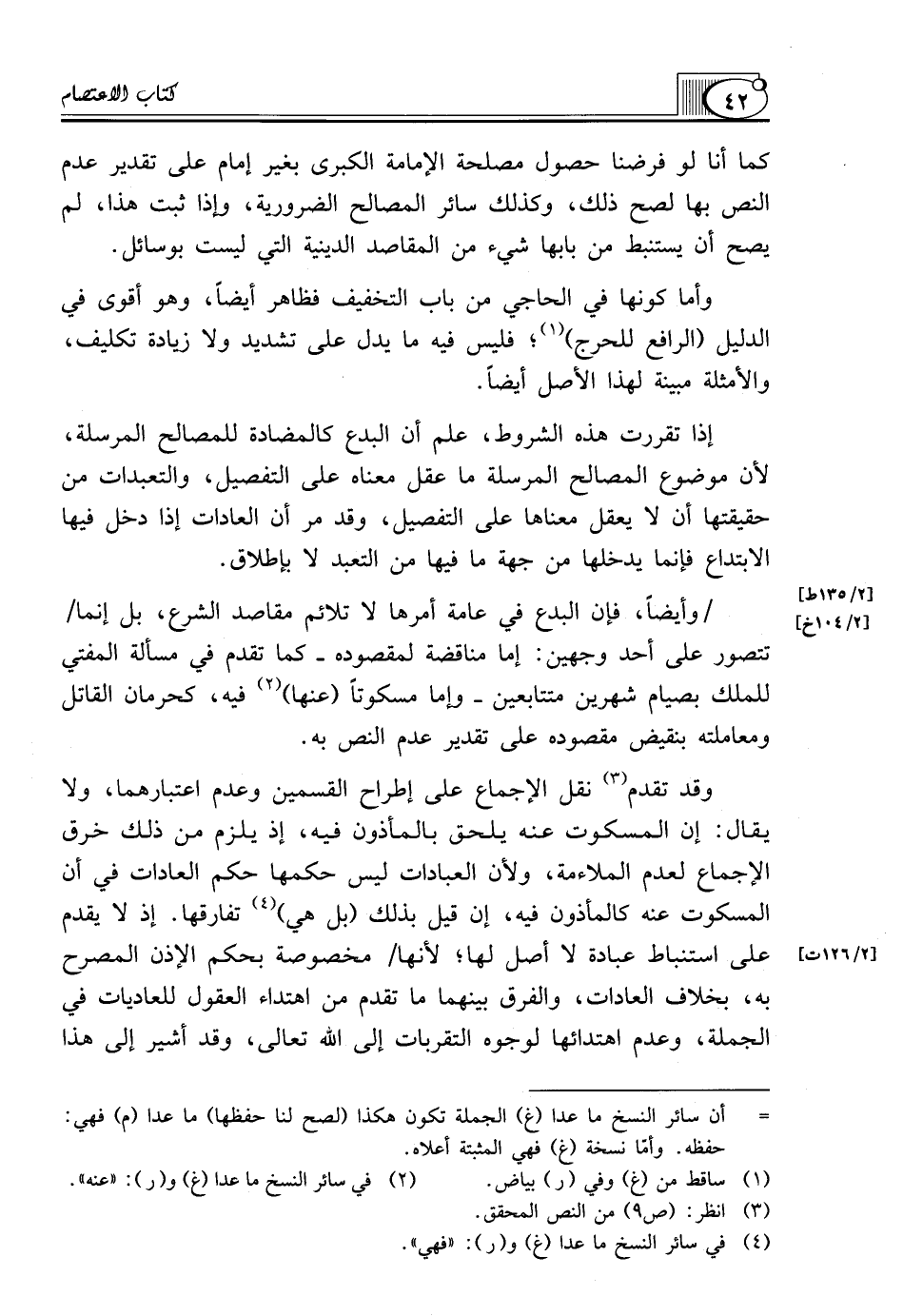 كَمَا أَنَّا لَوْ فَرَضْنَا حُصُولَ مَصْلَحَةِ الْإِمَامَةِ الْكُبْرَى بِغَيْرِ إِمَامٍ عَلَى تَقْدِيرِ عَدَمِ النَّصِّ بِهَا لَصَحَّ ذَلِكَ، وَكَذَلِكَ سَائِرُ الْمَصَالِحِ الضَّرُورِيَّةِ، وإذا ثَبَتَ هَذَا، لَمْ يَصِحَّ أَنْ يُسْتَنْبَطَ مِنْ بَابِهَا شَيْءٌ مِنَ الْمَقَاصِدِ الدِّينِيَّةِ الَّتِي لَيْسَتْ بِوَسَائِلَ.