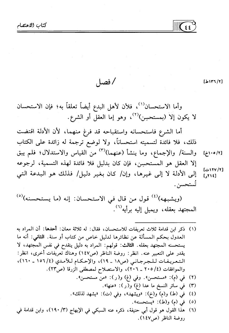 (¬1) ذكر ابن قدامة ثلاث تعريفات للاستحسان، فقال: له ثلاثة معان: أحدها: أن المراد به العدول بحكم المسألة عن نظائرها لدليل خاص من كتاب أو سنة. الثاني: أنه ما يستحسنه المجتهد بعقله. الثالث: قولهم: الْمُرَادَ بِهِ دَلِيلٌ يَنْقَدِحُ فِي نَفْسِ الْمُجْتَهِدِ، لا يقدر على التعبير عنه. انظر: روضة الناظر (ص147) وهناك تعريفات أخرى، انظر: التعريفات للجرجاني (ص18 ـ 19)، والإحكام للآمدي (4 156 ـ 160)، والموافقات (4 205 ـ 206)، والاستصلاح لمصطفى الزرقا (ص23).