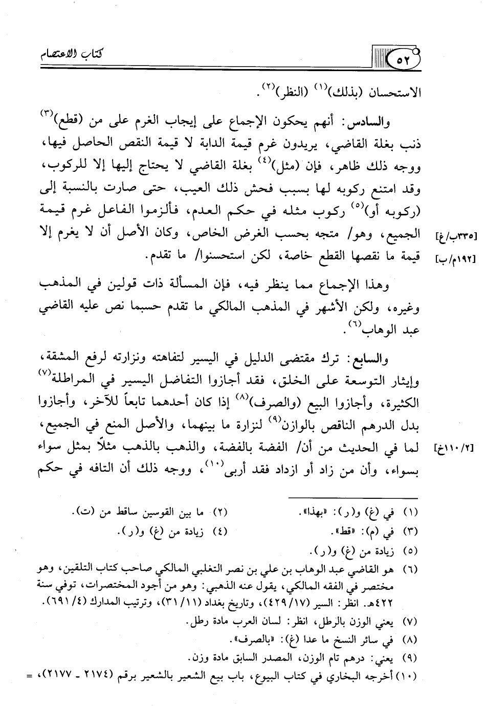وَهَذَا الْإِجْمَاعُ مِمَّا يُنْظَرُ فِيهِ، فَإِنَّ الْمَسْأَلَةَ ذَاتُ قَوْلَيْنِ فِي الْمَذْهَبِ وَغَيْرِهِ، وَلَكِنَّ الْأَشْهَرَ فِي الْمَذْهَبِ الْمَالِكِيِّ مَا تَقَدَّمَ حسبما نص عليه القاضي عبد الوهاب (¬6).