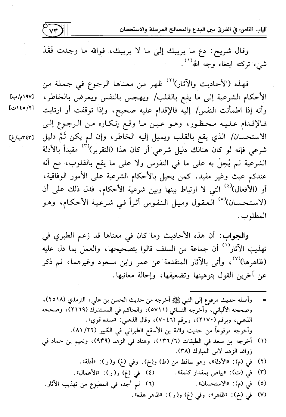 فهذه (الأحاديث والآثار) (¬2) ظَهَرَ مِنْ مَعْنَاهَا الرُّجُوعُ فِي جُمْلَةٍ مِنَ الْأَحْكَامِ الشَّرْعِيَّةِ إِلَى مَا يَقَعُ بِالْقَلْبِ/ وَيَهْجِسُ بِالنَّفْسِ وَيَعْرِضُ بِالْخَاطِرِ، وَأَنَّهُ إِذَا اطْمَأَنَّتِ النَّفْسُ/ إِلَيْهِ فَالْإِقْدَامُ عَلَيْهِ صَحِيحٌ، وَإِذَا تَوَقَّفَتْ أَوِ ارْتَابَتْ فَالْإِقْدَامُ عَلَيْهِ مَحْظُورٌ، وَهُوَ عَيْنُ مَا وَقَعَ إِنْكَارُهُ مِنَ الرُّجُوعِ إِلَى الِاسْتِحْسَانِ/ الَّذِي يَقَعُ بِالْقَلْبِ وَيَمِيلُ إِلَيْهِ الْخَاطِرُ، وَإِنْ لَمْ يَكُنْ ثَمَّ دَلِيلٌ شَرْعِيٌّ فَإِنَّهُ لَوْ كَانَ هُنَالِكَ دَلِيلٌ شَرْعِيٌّ أَوْ كَانَ هَذَا (التَّقْرِيرُ) (¬3) مُقَيَّدًا بِالْأَدِلَّةِ الشَّرْعِيَّةِ لَمْ يُحِلْ بِهِ عَلَى مَا فِي النُّفُوسِ وَلَا عَلَى مَا يَقَعُ بِالْقُلُوبِ، مَعَ أَنَّهُ عِنْدَكُمْ عَبَثٌ وَغَيْرُ مُفِيدٍ، كَمَنْ يُحِيلُ بِالْأَحْكَامِ الشَّرْعِيَّةِ عَلَى الْأُمُورِ الْوِفَاقِيَّةِ، أَوِ (الْأَفْعَالِ) (¬4) الَّتِي لَا ارْتِبَاطَ بَيْنَهَا وَبَيْنَ شَرْعِيَّةِ الْأَحْكَامِ، فَدَلَّ ذَلِكَ عَلَى أَنَّ (لِاسْتِحْسَانِ) (¬5) الْعُقُولِ وَمَيْلِ النُّفُوسِ أَثَرًا فِي شَرْعِيَّةِ الْأَحْكَامِ، وَهُوَ الْمَطْلُوبُ.