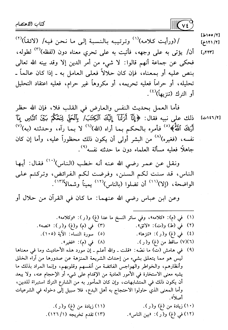(¬9) في هامش (ت) ما نصّه: "قلت ـ والله أعلم ـ إن مورد هذه الأحاديث وما في معناها ليس هو مما يتعلق بشيء من إحداث الشريعة المنزهة عن صدورها من آراء الخلق وأنظارهم، والخواطر والهواجس الفائضة من أنفسهم وقلوبهم، وإنما المراد بذلك ما يشبه معنى الاستخارة في الأمور العادية من الإقدام على شيء أو الإحجام عنه، ولا يبعد أن يكون ذلك في المتشابهات، وإن كان المأمور به من الشارع الترك استبراءً للدين، وأما المعنى الذي حاولوا الاحتجاج به أهل البدع، فلا سبيل إلى دخوله في الشرعيات أصلاً".