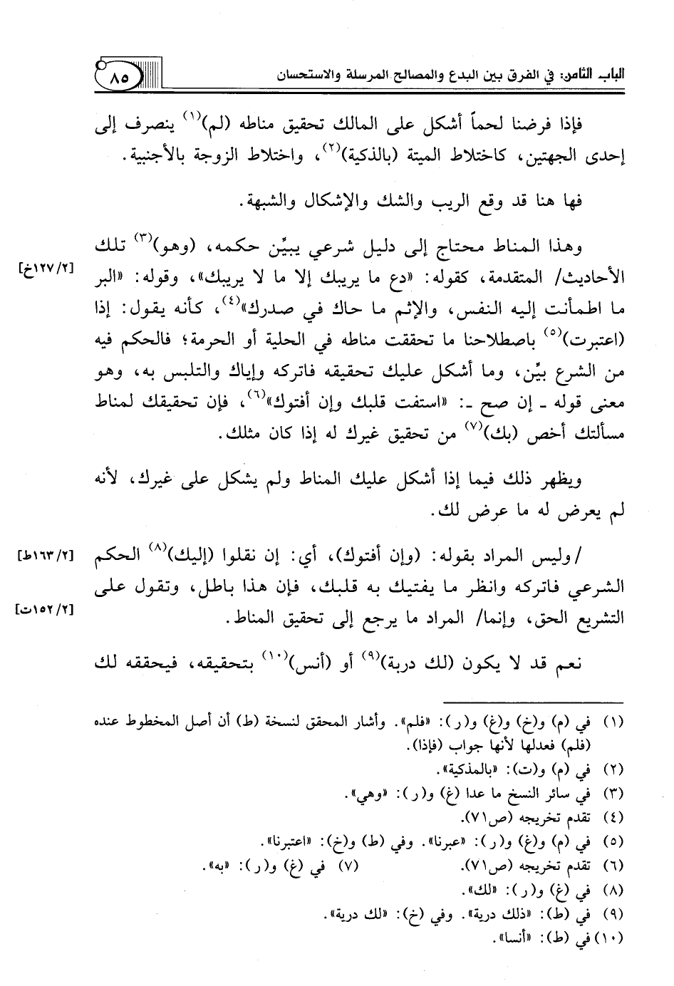 وَهَذَا الْمَنَاطُ مُحْتَاجٌ إِلَى دَلِيلٍ شَرْعِيٍّ يبيِّن حُكْمَهُ، (وهو) (¬3) تِلْكَ الْأَحَادِيثُ/ الْمُتَقَدِّمَةُ، كَقَوْلِهِ: "دَعْ مَا يَرِيبُكَ إلا مَا لَا يَرِيبُكَ"، وَقَوْلُهُ: "الْبِرُّ مَا اطْمَأَنَّتْ إِلَيْهِ النَّفْسُ، وَالْإِثْمُ مَا حَاكَ فِي صَدْرِكَ" (¬4)، كأنه يقول: إذا (اعتبرت) (¬5) بِاصْطِلَاحِنَا مَا تَحَقَّقْتَ مَنَاطَهُ فِي الْحِلِّيَّةِ أَوِ الْحُرْمَةِ؛ فَالْحُكْمُ فِيهِ مِنَ الشَّرْعِ بيِّن، وَمَا أَشْكَلَ عَلَيْكَ تَحْقِيقُهُ فَاتْرُكْهُ وَإِيَّاكَ وَالتَّلَبُّسَ بِهِ، وَهُوَ مَعْنَى قَوْلِهِ ـ إِنْ صَحَّ ـ: "اسْتَفْتِ قَلْبَكَ وَإِنْ أَفْتَوْكَ" (¬6)، فَإِنَّ تَحْقِيقَكَ لِمَنَاطِ مَسْأَلَتِكَ أَخَصُّ (بِكَ) (¬7) مِنْ تَحْقِيقِ غَيْرِكَ لَهُ إِذَا كَانَ مِثْلَكَ.