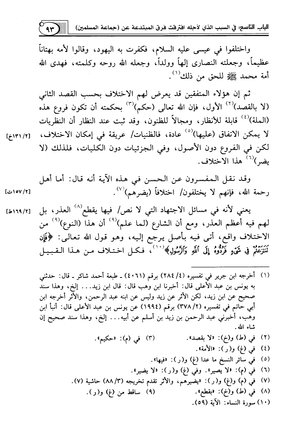 ثُمَّ إِنَّ هَؤُلَاءِ الْمُتَّفِقِينَ قَدْ يَعْرِضُ لَهُمُ الاختلاف بحسب القصد الثاني (لا بالقصد) (¬2) الأول، فإن الله تعالى (حكم) (¬3) بِحِكْمَتِهِ أَنْ تَكُونَ فُرُوعُ هَذِهِ (الْمِلَّةِ) (¬4) قَابِلَةً لِلْأَنْظَارِ، وَمَجَالًا لِلظُّنُونِ، وَقَدْ ثَبَتَ عِنْدَ النُّظَّارِ أن النظريات لا يمكن الاتفاق (عليها) (¬5) عَادَةً، فَالظَّنِّيَّاتُ/ عَرِيقَةٌ فِي إِمْكَانِ الِاخْتِلَافِ، لَكِنْ فِي الْفُرُوعِ دُونَ الْأُصُولِ، وَفِي الْجُزْئِيَّاتِ دُونَ الْكُلِّيَّاتِ، فَلِذَلِكَ (لَا يَضُرُّ) (¬6) هَذَا الِاخْتِلَافُ.