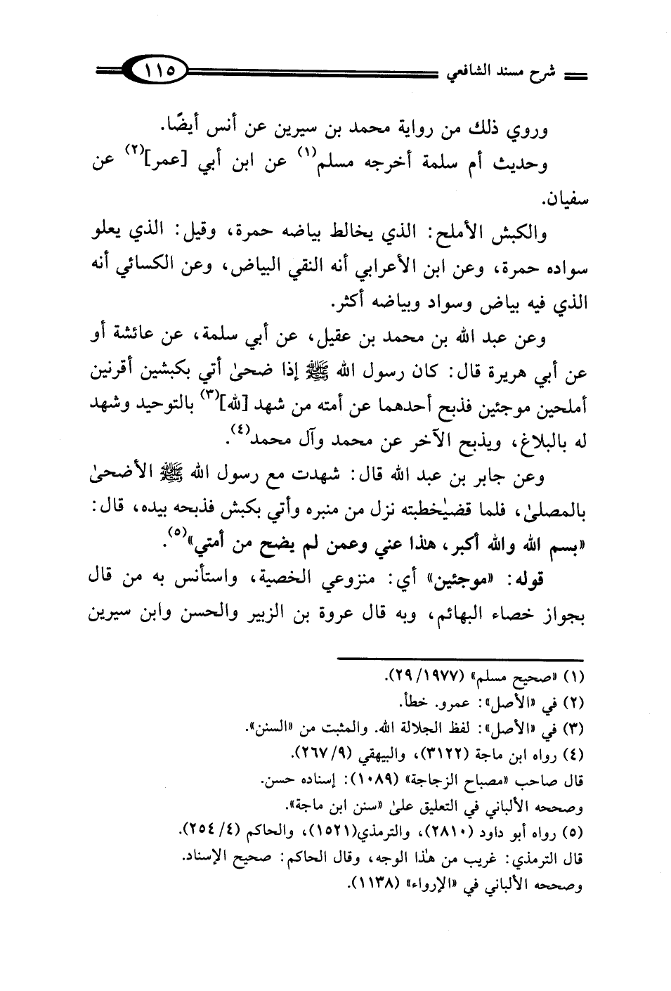 وعن عبد الله بن محمَّد بن عقيل، عن أبي سلمة، عن عائشة أو عن أبي هريرة قال: كان رسول الله - صلى الله عليه وسلم - إذا ضحى أتي بكبشين أقرنين أملحين موجئين فذبح أحدهما عن أمته من شهد [لله] (¬3) بالتوحيد وشهد له بالبلاغ، ويذبح الآخر عن محمَّد وآل محمَّد (¬4).