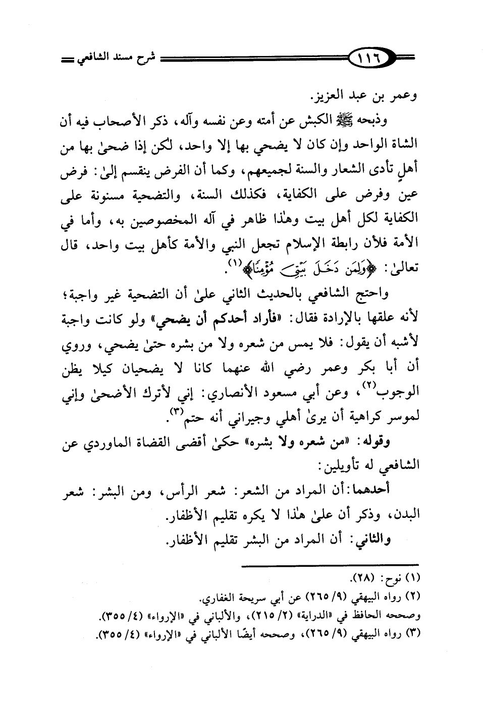 واحتج الشافعي بالحديث الثاني على أن التضحية غير واجبة؛ لأنه علقها بالإرادة فقال: "فأراد أحدكم أن يضحي" ولو كانت واجبة لأشبه أن يقول: فلا يمس من شعره ولا من بشره حتى يضحي، وروي أن أبا بكر وعمر رضي الله عنهما كانا لا يضحيان كيلا يظن الوجوب (¬2)، وعن أبي مسعود الأنصاري: إني لأترك الأضحى وإني لموسر كراهية أن يرى أهلي وجيراني أنه حتم (¬3).