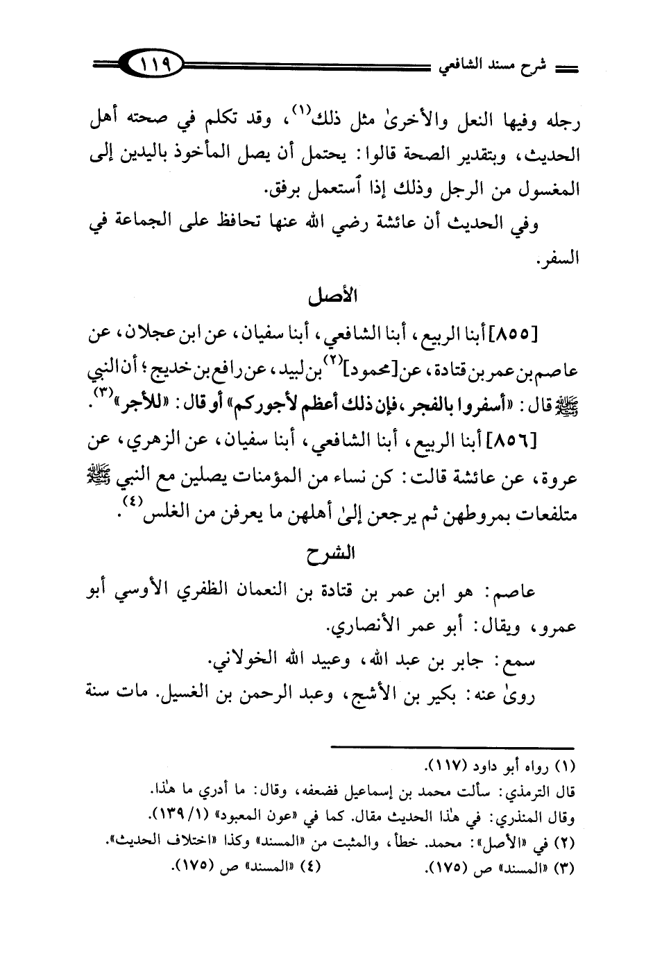 [855] أبنا الربيع، أبنا الشافعي، أبنا سفيان، عن ابن عجلان، عن عاصم بن عمر بن قتادة، عن [محمود] (¬2) بن لبيد، عن رافع بن خديج؛ أن النبي - صلى الله عليه وسلم - قال: "أسفروا بالفجر، فإن ذلك أعظم لأجوركم" أو قال: "للأجر" (¬3).