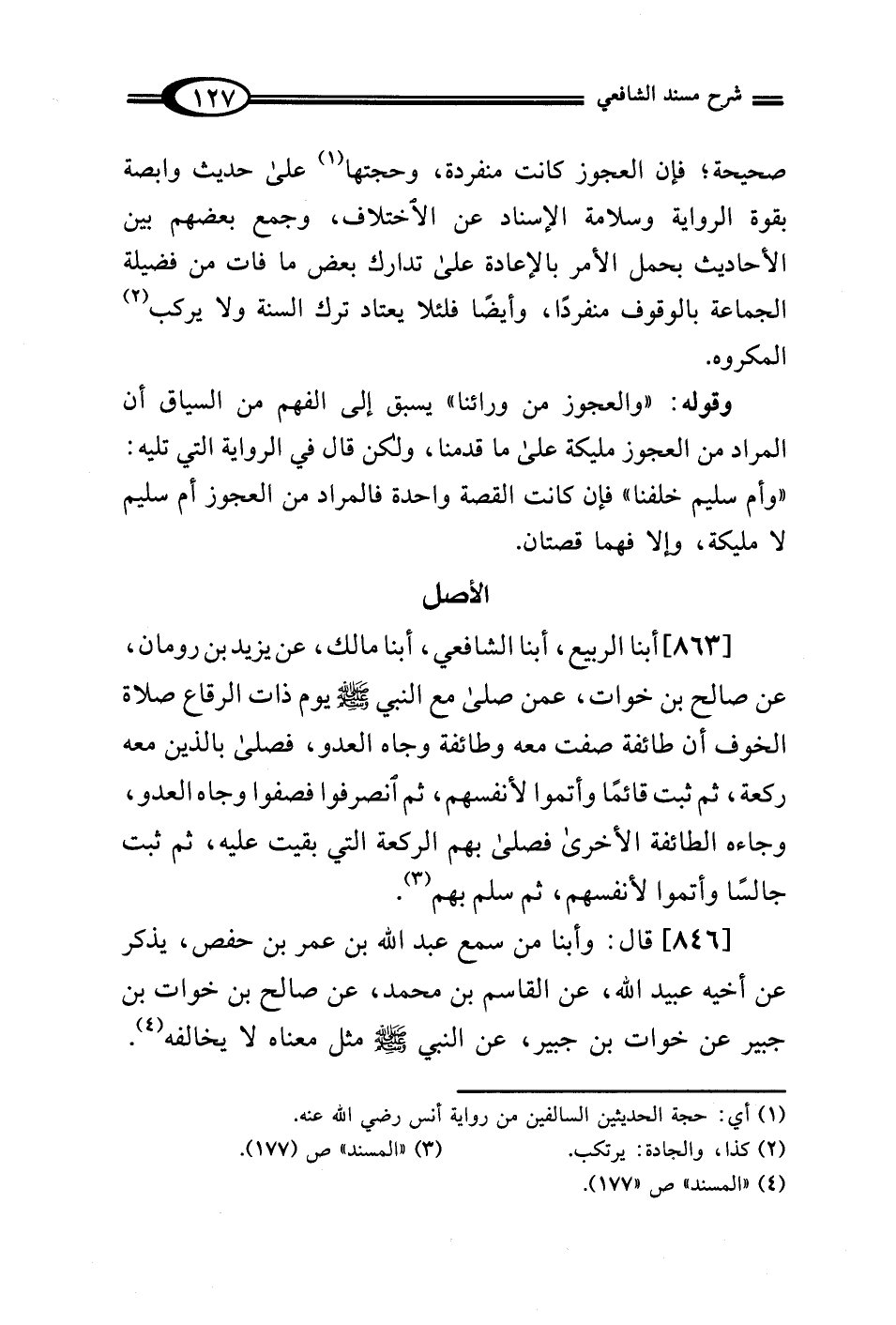 [863] أبنا الربيع، أبنا الشافعي، أبنا مالك، عن يزيد بن رومان، عن صالح بن خوات، عمن صلى مع النبي - صلى الله عليه وسلم - يوم ذات الرقاع صلاة الخوف أن طائفة صفت معه وطائفة وجاه العدو، فصلى بالذين معه ركعة، ثم ثبت قائمًا وأتموا لأنفسهم، ثم انصرفوا فصفوا وجاه العدو، وجاءه الطائفة الأخرى فصلى بهم الركعة التي بقيت عليه، ثم ثبت جالسًا وأتموا لأنفسهم، ثم سلم بهم (¬3).