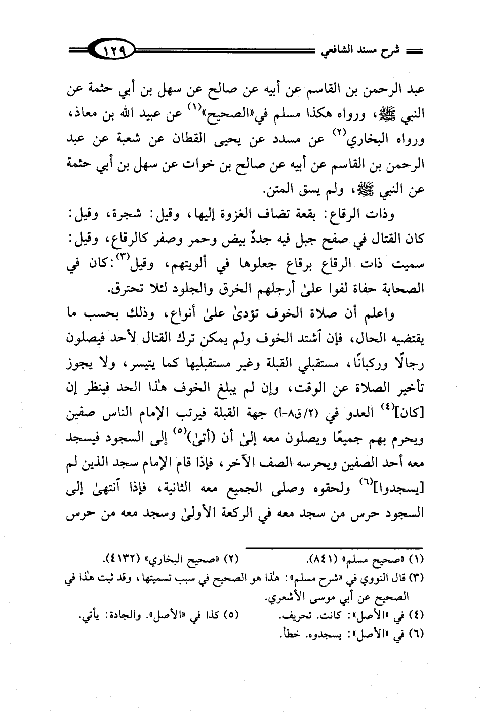 عبد الرحمن بن القاسم عن أبيه عن صالح عن سهل بن أبي حثمة عن النبي - صلى الله عليه وسلم -، ورواه هكذا مسلم في "الصحيح" (¬1) عن عبيد الله بن معاذ، ورواه البخاري (¬2) عن مسدد عن يحيى القطان عن شعبة عن عبد الرحمن بن القاسم عن أبيه عن صالح بن خوات عن سهل بن أبي حثمة عن النبي - صلى الله عليه وسلم -، ولم يسق المتن.