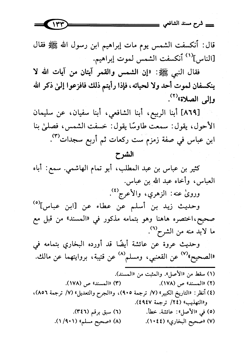 [869] أبنا الربيع، أبنا الشافعي، أبنا سفيان، عن سليمان الأحول، يقول: سمعت طاوسًا يقول: خسفت الشمس، فصلى بنا ابن عباس في صفة زمزم ست ركعات ثم أربع سجدات (¬3).