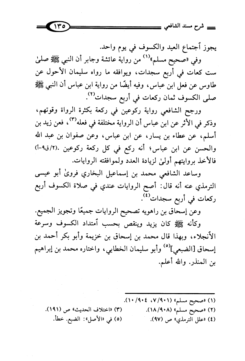 ورجح الشافعي رواية ركوعين في ركعة بكثرة الرواة وقوتهم، وذكر في الأثر عن ابن عباس أن الرواية مختلفة في فعله (¬3)، فعن زيد بن أسلم، عن عطاء بن يسار، عن ابن عباس، وعن صفوان بن عبد الله والحسن عن ابن عباس؛ أنه ركع في كل ركعة ركوعين.
