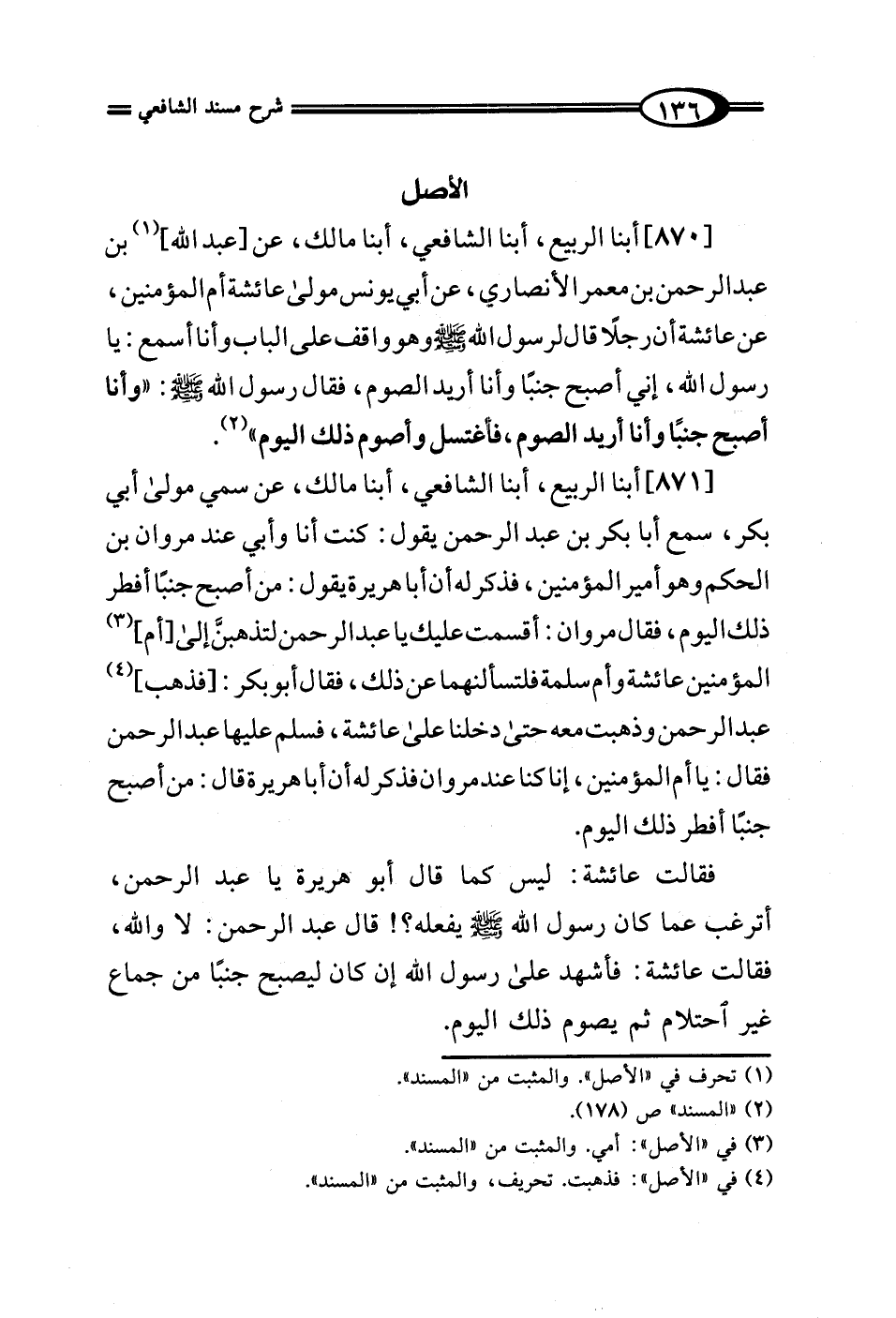 [871] أبنا الربيع، أبنا الشافعي، أبنا مالك، عن سمي مولى أبي بكر، سمع أبا بكر بن عبد الرحمن يقول: كنت أنا وأبي عند مروان بن الحكم وهو أمير المؤمنين، فذكر له أن أبا هريرة يقول: من أصبح جنبًا أفطر ذلك اليوم، فقال مروان: أقسمت عليك يا عبد الرحمن لتذهبنَّ إلى [أم] (¬3) المؤمنين عائشة وأم سلمة فلتسألنهما عن ذلك، فقال أبو بكر: [فذهب] (¬4) عبد الرحمن وذهبت معه حتى دخلنا على عائشة، فسلم عليها عبد الرحمن فقال: يا أم المؤمنين، إنا كنا عند مروان فذكر له أن أبا هريرة قال: من أصبح جنبًا أفطر ذلك اليوم.