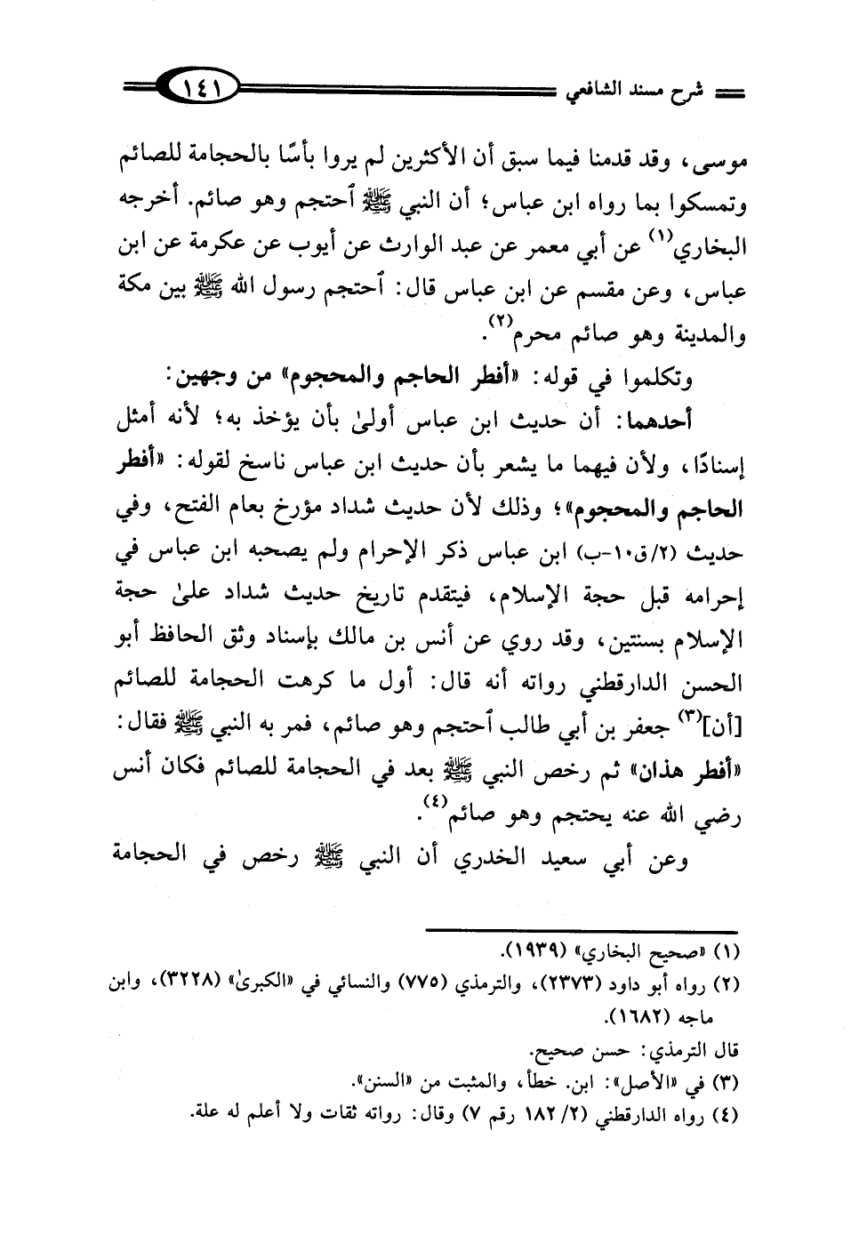 أحدهما: أن حديث ابن عباس أولى بأن يؤخذ به؛ لأنه أمثل إسنادًا، ولأن فيهما ما يشعر بأن حديث ابن عباس ناسخ لقوله: "أفطر الحاجم والمحجوم"؛ وذلك لأن حديث شداد مؤرخ بعام الفتح، وفي حديث ابن عباس ذكر الإحرام ولم يصحبه ابن عباس في إحرامه قبل حجة الإِسلام، فيتقدم تاريخ حديث شداد على حجة الإِسلام بسنتين، وقد روي عن أنس بن مالك بإسناد وثق الحافظ أبو الحسن الدارقطني رواته أنه قال: أول ما كرهت الحجامة للصائم [أن] (¬3) جعفر بن أبي طالب احتجم وهو صائم، فمر به النبي - صلى الله عليه وسلم - فقال: "أفطر هذان" ثم رخص النبي - صلى الله عليه وسلم - بعد في الحجامة للصائم فكان أنس رضي الله عنه يحتجم وهو صائم (¬4).