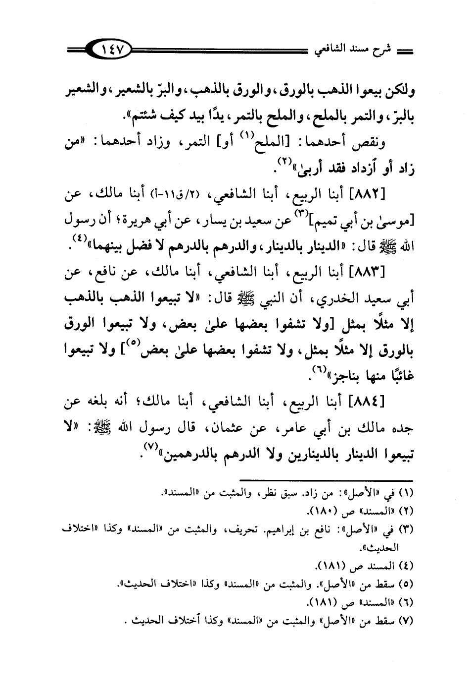 [884] أبنا الربيع، أبنا الشافعي، أبنا مالك؛ أنه بلغه عن جده مالك بن أبي عامر، عن عثمان، قال رسول الله - صلى الله عليه وسلم -: "لا تبيعوا الدينار بالدينارين ولا الدرهم بالدرهمين" (¬7).