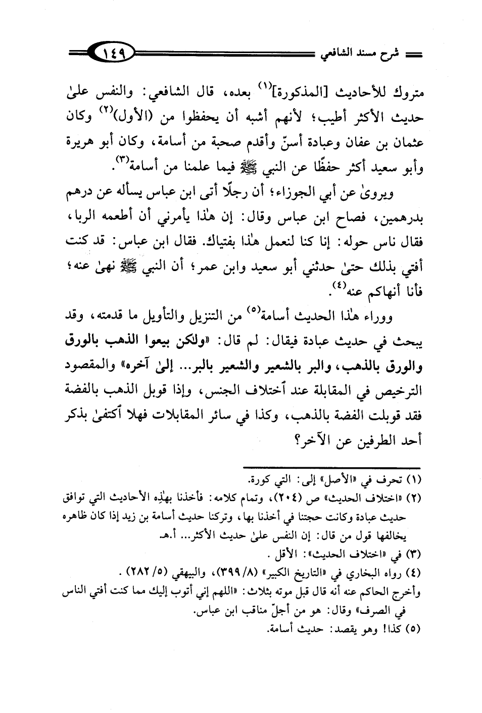 (¬2) "اختلاف الحديث" ص (204)، وتمام كلامه: فأخذنا بهذه الأحاديث التي توافق حديث عبادة وكانت حجتنا في أخذنا بها، وتركنا حديث أسامة بن زيد إذا كان ظاهره يخالفها قول من قال: إن النفس على حديث الأكثر ... أهـ.