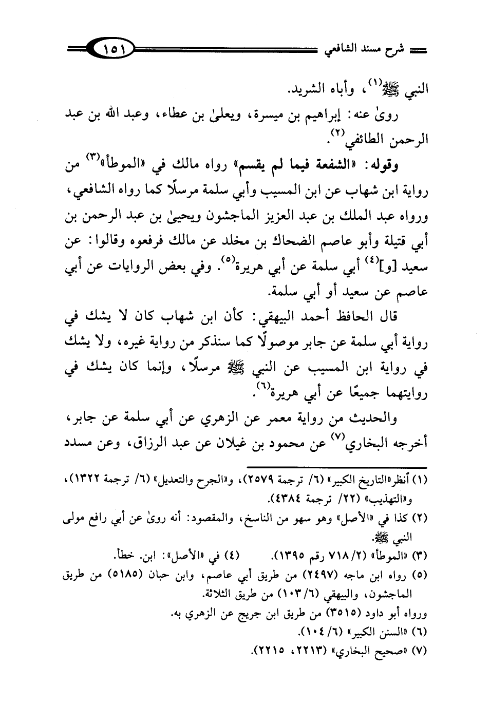 وقوله: "الشفعة فيما لم يقسم" رواه مالك في "الموطأ" (¬3) من رواية ابن شهاب عن ابن المسيب وأبي سلمة مرسلًا كما رواه الشافعي، ورواه عبد الملك بن عبد العزيز الماجشون ويحيى بن عبد الرحمن بن أبي قتيلة وأبو عاصم الضحاك بن مخلد عن مالك فرفعوه وقالوا: عن سعيد [و] (¬4) أبي سلمة عن أبي هريرة (¬5). وفي بعض الروايات عن أبي عاصم عن سعيد أو أبي سلمة.
