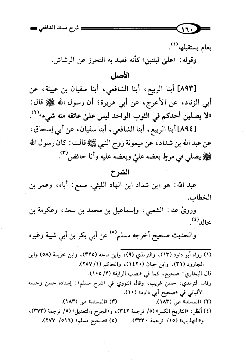 [893] أبنا الربيع، أبنا الشافعي، أبنا سفيان بن عيينة، عن أبي الزناد، عن الأعرج، عن أبي هريرة؛ أن رسول الله - صلى الله عليه وسلم - قال: "لا يصلين أحدكم في الثوب الواحد ليس على عاتقه منه شيء" (¬2).