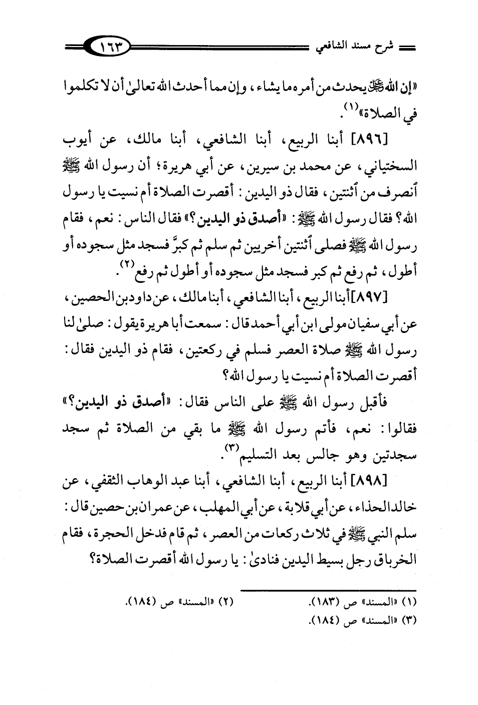 [898] أبنا الربيع، أبنا الشافعي، أبنا عبد الوهاب الثقفي، عن خالد الحذاء، عن أبي قلابة، عن أبي المهلب، عن عمران بن حصين قال: سلم النبي - صلى الله عليه وسلم - في ثلاث ركعات من العصر، ثم قام فدخل الحجرة، فقام الخرباق رجل بسيط اليدين فنادى: يا رسول الله أقصرت الصلاة؟