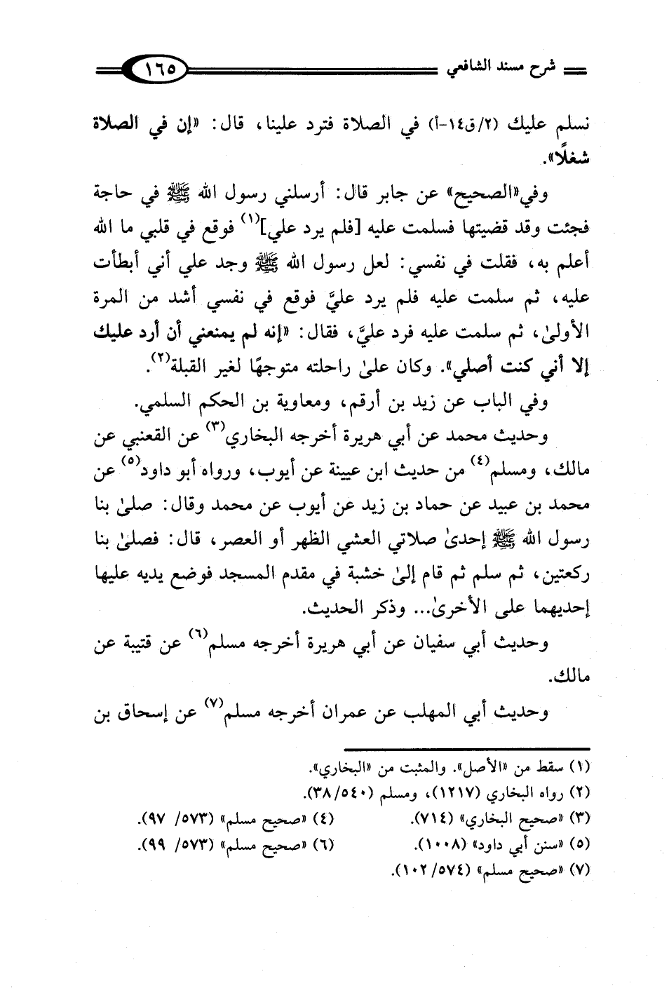وفي "الصحيح" عن جابر قال: أرسلني رسول الله - صلى الله عليه وسلم - في حاجة فجئت وقد قضيتها فسلمت عليه [فلم يرد علي] (¬1) فوقع في قلبي ما الله أعلم به، فقلت في نفسي: لعل رسول الله - صلى الله عليه وسلم - وجد علي أني أبطأت عليه، ثم سلمت عليه فلم يرد عليَّ فوقع في نفسي أشد من المرة الأولى، ثم سلمت عليه فرد عليَّ، فقال: "إنه لم يمنعني أن أرد عليك إلا أني كنت أصلي". وكان على راحلته متوجهًا لغير القبلة (¬2).