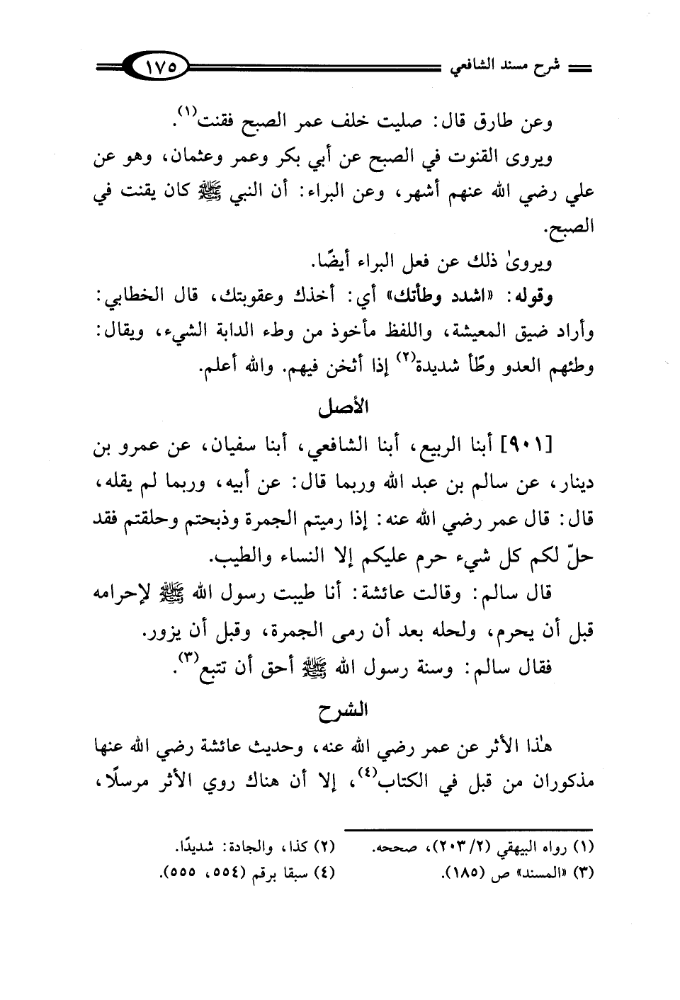 [901] أبنا الربيع، أبنا الشافعي، أبنا سفيان، عن عمرو بن دينار، عن سالم بن عبد الله وربما قال: عن أبيه، وربما لم يقله، قال: قال عمر رضي الله عنه: إذا رميتم الجمرة وذبحتم وحلقتم فقد حلّ لكم كل شيء حرم عليكم إلا النساء والطيب.