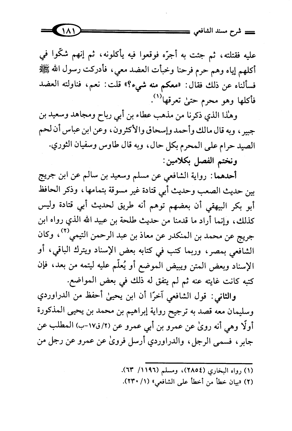 أحدهما: رواية الشافعي عن مسلم وسعيد بن سالم عن ابن جريج بين حديث الصعب وحديث أبي قتادة غير مسوقة بتمامها، وذكر الحافظ أبو بكر البيهقي أن بعضهم توهم أنه طريق لحديث أبي قتادة وليس كذلك، وإنما أراد ما قدمنا من حديث طلحة بن عبيد الله الذي رواه ابن جريج عن محمَّد بن المنكدر عن معاذ بن عبد الرحمن التيمي (¬2)، وكان الشافعي بمصر، وربما كتب في كتابه بعض الإسناد ويترك الباقي، أو الإسناد وبعض المتن ويبيض الموضع أو يُعلّم عليه ليتمه من بعد، فإن كتبه كانت غايته عنه ثم لم يتفق له ذلك في بعض المواضع.