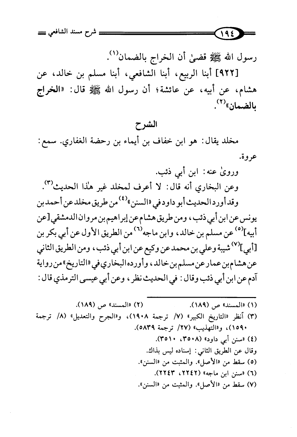 [922] أبنا الربيع، أبنا الشافعي، أبنا مسلم بن خالد، عن هشام، عن أبيه، عن عائشة؛ أن رسول الله - صلى الله عليه وسلم - قال: "الخراج بالضمان" (¬2).
