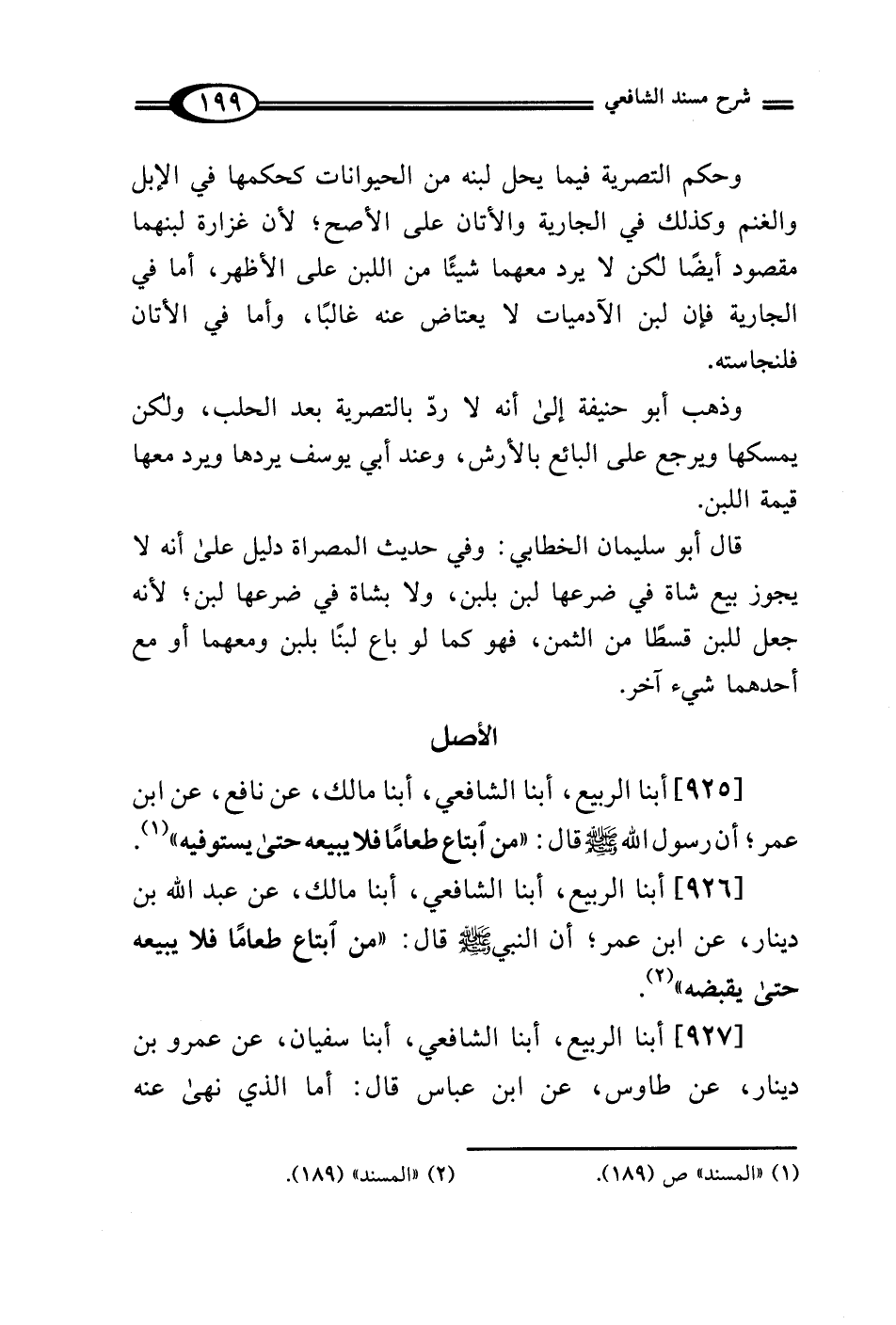 [926] أبنا الربيع، أبنا الشافعي، أبنا مالك، عن عبد الله بن دينار، عن ابن عمر؛ أن النبي - صلى الله عليه وسلم - قال: "من ابتاع طعامًا فلا يبيعه حتى يقبضه" (¬2).