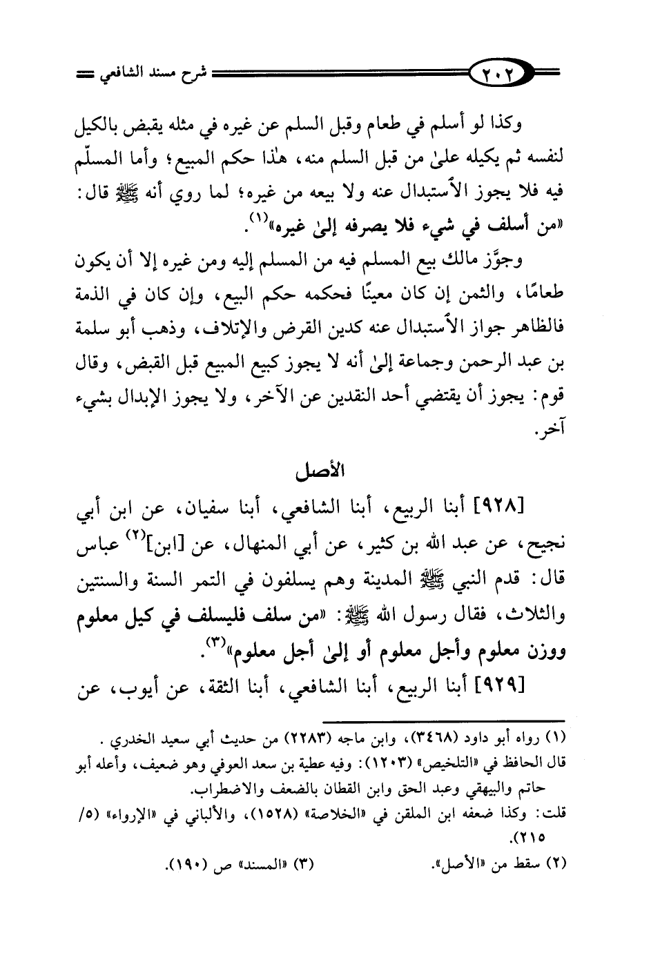 [928] أبنا الربيع، أبنا الشافعي، أبنا سفيان، عن ابن أبي نجيح، عن عبد الله بن كثير، عن أبي المنهال، عن [ابن] (¬2) عباس قال: قدم النبي - صلى الله عليه وسلم - المدينة وهم يسلفون في التمر السنة والسنتين والثلاث، فقال رسول الله - صلى الله عليه وسلم -: "من سلف فليسلف في كيل معلوم وززن معلوم وأجل معلوم أو إلى أجل معلوم" (¬3).