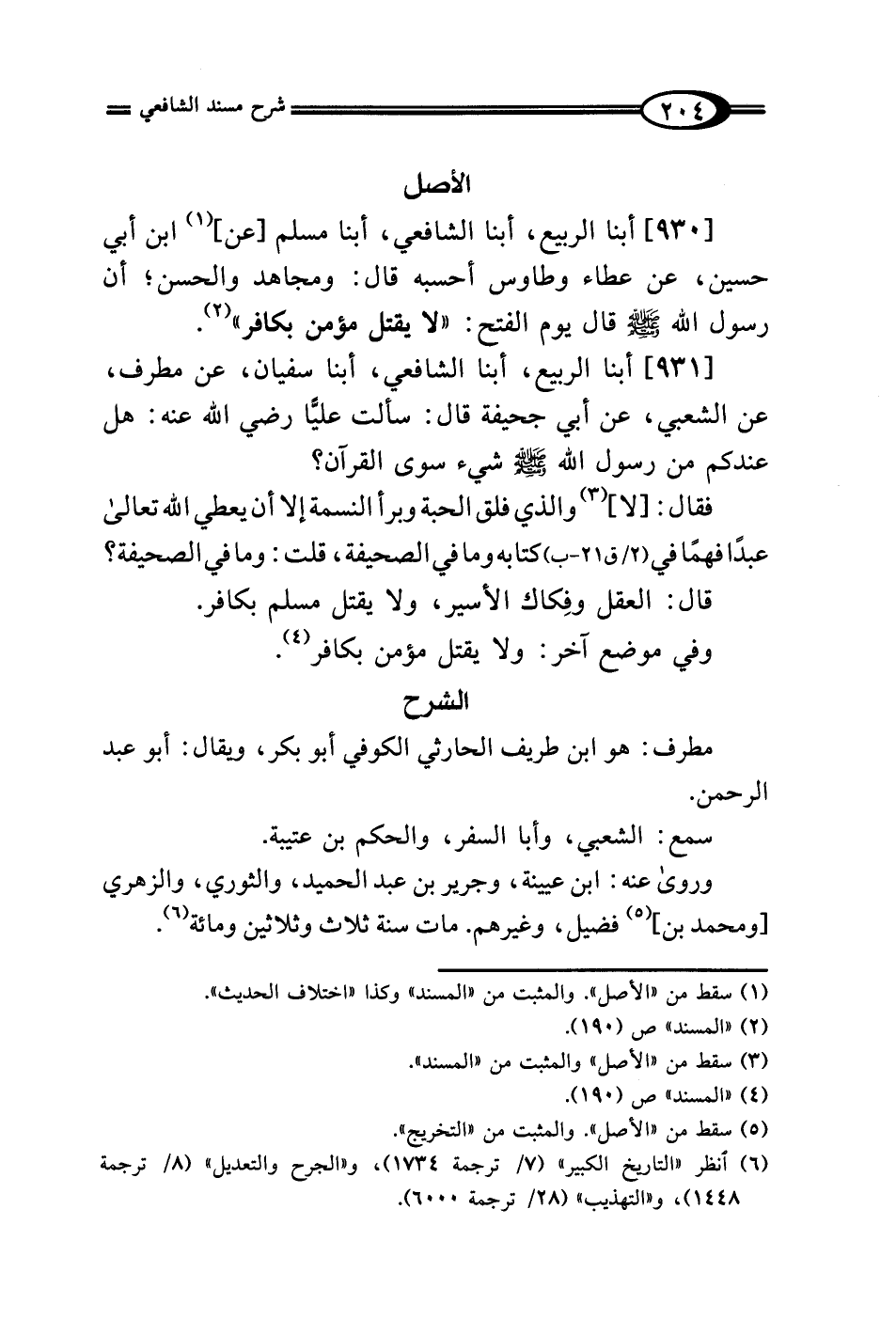 [931] أبنا الربيع، أبنا الشافعي، أبنا سفيان، عن مطرف، عن الشعبي، عن أبي جحيفة قال: سألت عليًّا رضي الله عنه: هل عندكم من رسول الله - صلى الله عليه وسلم - شيء سوى القرآن؟