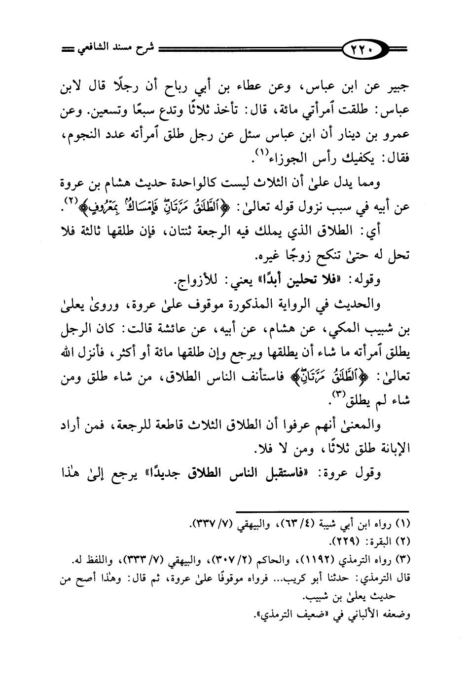 والحديث في الرواية المذكورة موقوف على عروة، وروى يعلى بن شبيب المكي، عن هشام، عن أبيه، عن عائشة قالت: كان الرجل يطلق امرأته ما شاء أن يطلقها ويرجع وإن طلقها مائة أو أكثر، فأنزل الله تعالى: {الطَّلَاقُ مَرَّتَانِ} فاستأنف الناس الطلاق، من شاء طلق ومن شاء لم يطلق (¬3).