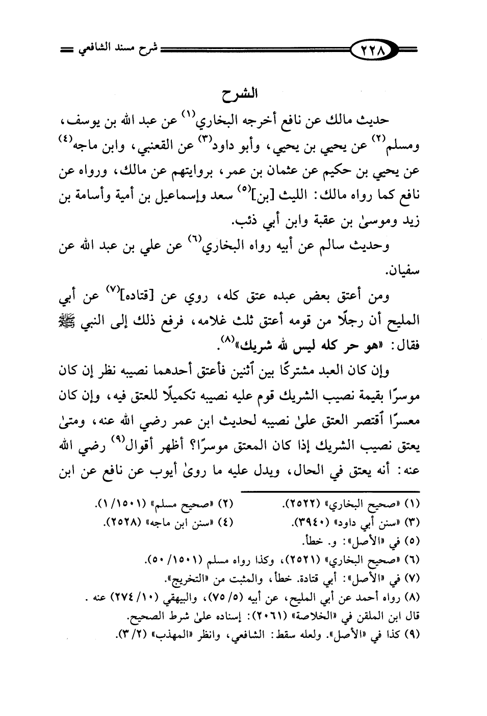 حديث مالك عن نافع أخرجه البخاري (¬1) عن عبد الله بن يوسف، ومسلم (¬2) عن يحيى بن يحيى، وأبو داود (¬3) عن القعنبي، وابن ماجه (¬4) عن يحيى بن حكيم عن عثمان بن عمر، بروايتهم عن مالك، ورواه عن نافع كما رواه مالك: الليث [بن] (¬5) سعد وإسماعيل بن أمية وأسامة بن زيد وموسى بن عقبة وابن أبي ذئب.