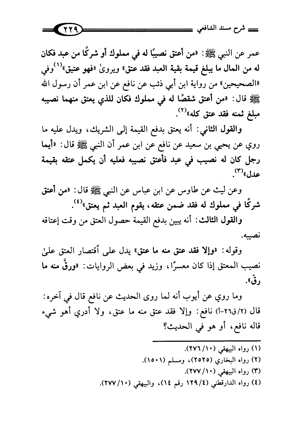 والقول الثاني: أنه يعتق بدفع القيمة إلى الشريك، ويدل عليه ما روي عن عمرو بن سعيد عن نافع عن ابن عمر أن النبي - صلى الله عليه وسلم - قال: "أيما رجل كان له نصيب في عبد فأعتق نصيبه فعليه أن يكمل عتقه بقيمة عدل" (¬3).
