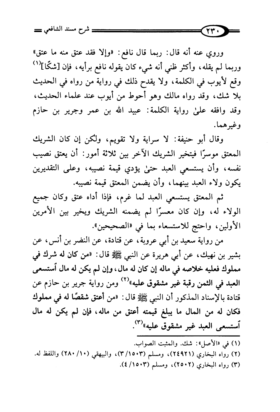 من رواية سعيد بن أبي عروبة، عن قتادة، عن النضر بن أنس، عن بشير بن نهيك، عن أبي هريرة عن النبي - صلى الله عليه وسلم - قال: "من كان له شرك في مملوك فعليه خلاصه في ماله إن كان له مال، وإن لم يكن له مال استسعى العبد في الثمن رقبة غير مشقوق عليه" (¬2) ومن رواية جرير بن حازم عن قتادة بالإسناد المذكور أن النبي - صلى الله عليه وسلم - قال: "من أعتق شقصًا له في مملوك فكان له من المال ما يبلغ قيمته أعتق من ماله، فإن لم يكن له مال استسعى العبد غير مشقوق عليه" (¬3).