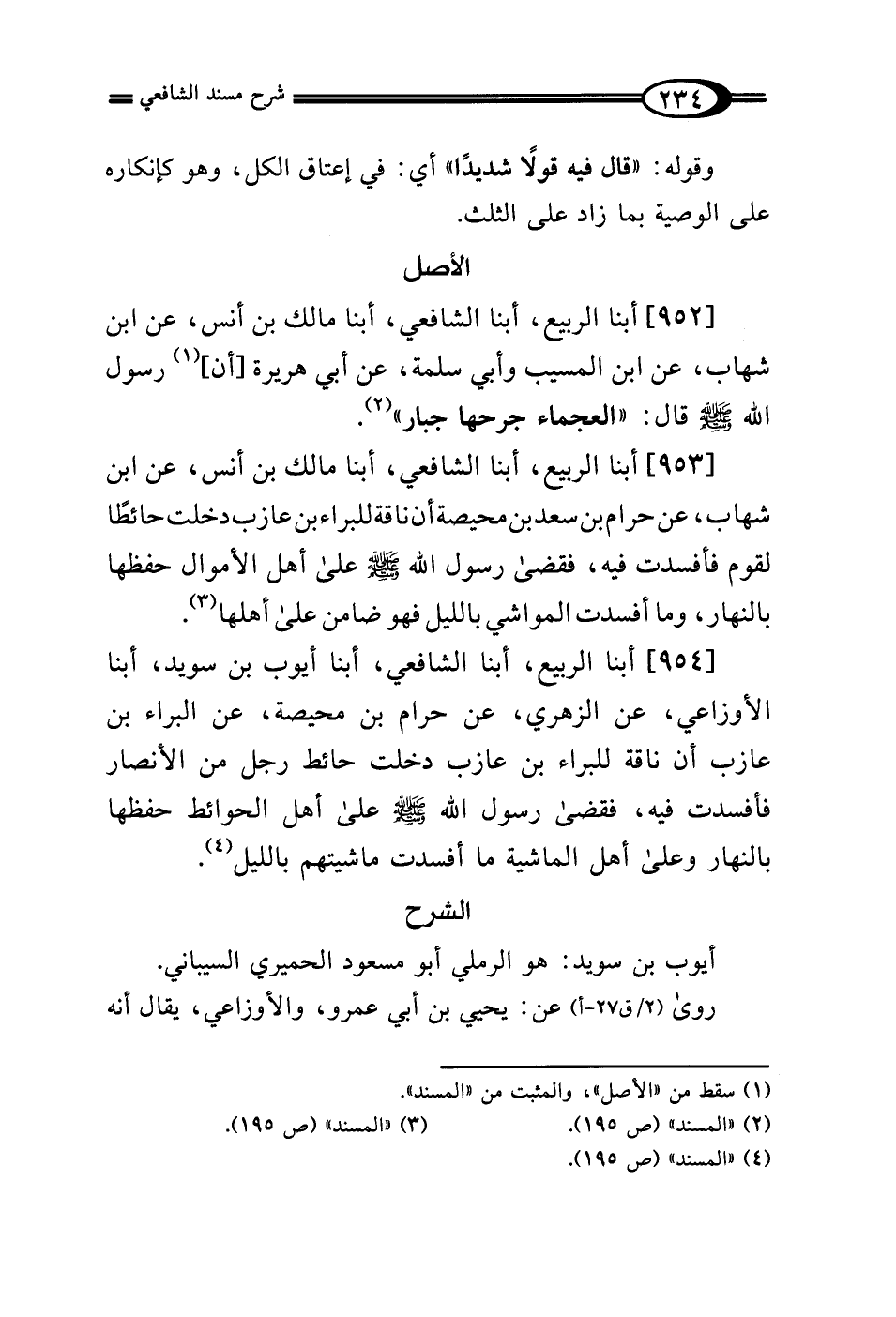[954] أبنا الربيع، أبنا الشافعي، أبنا أيوب بن سويد، أبنا الأوزاعي، عن الزهري، عن حرام بن محيصة، عن البراء بن عازب أن ناقة للبراء بن عازب دخلت حائط رجل من الأنصار فأفسدت فيه، فقضى رسول الله - صلى الله عليه وسلم - على أهل الحوائط حفظها بالنهار وعلى أهل الماشية ما أفسدت ماشيتهم بالليل (¬4).